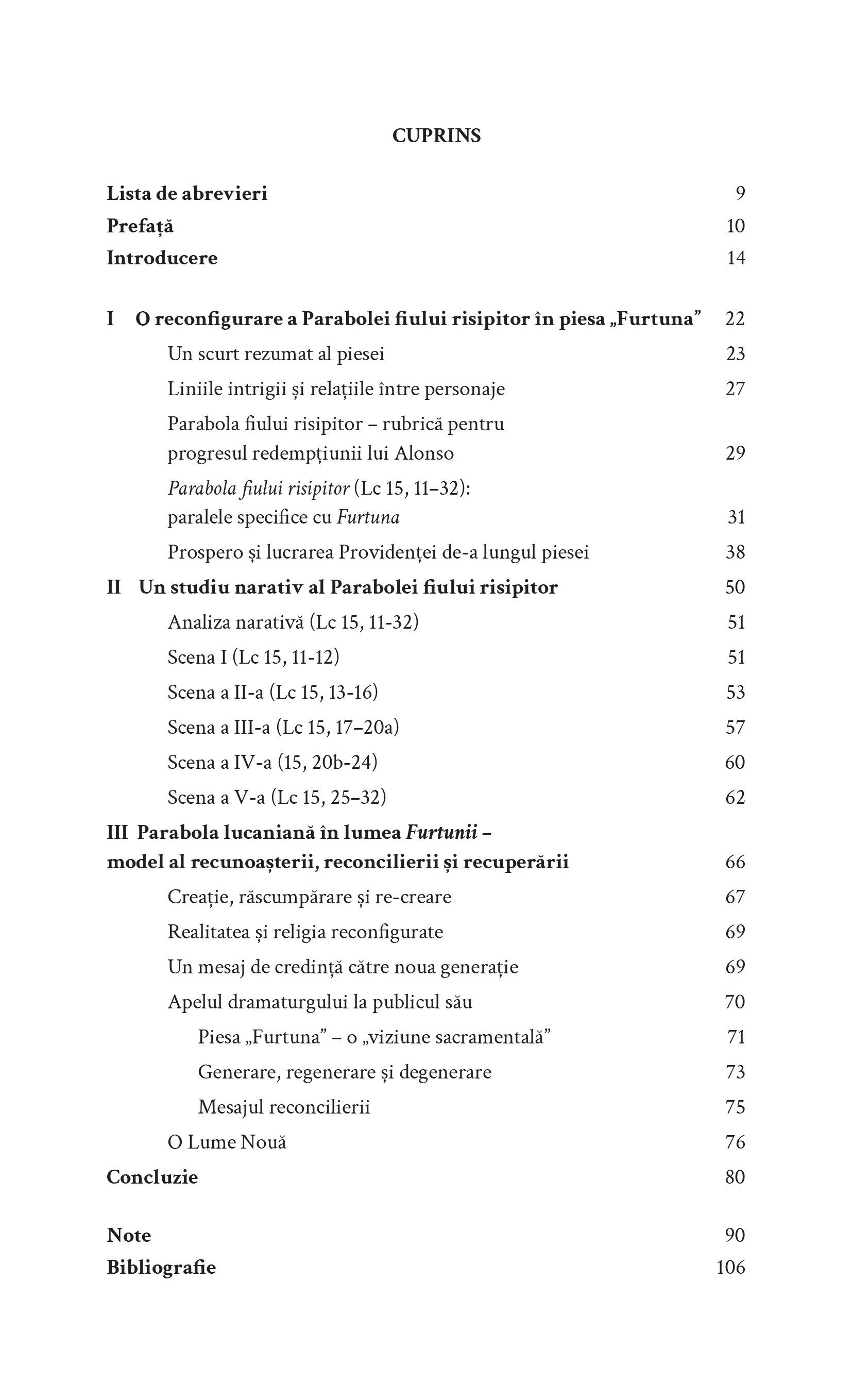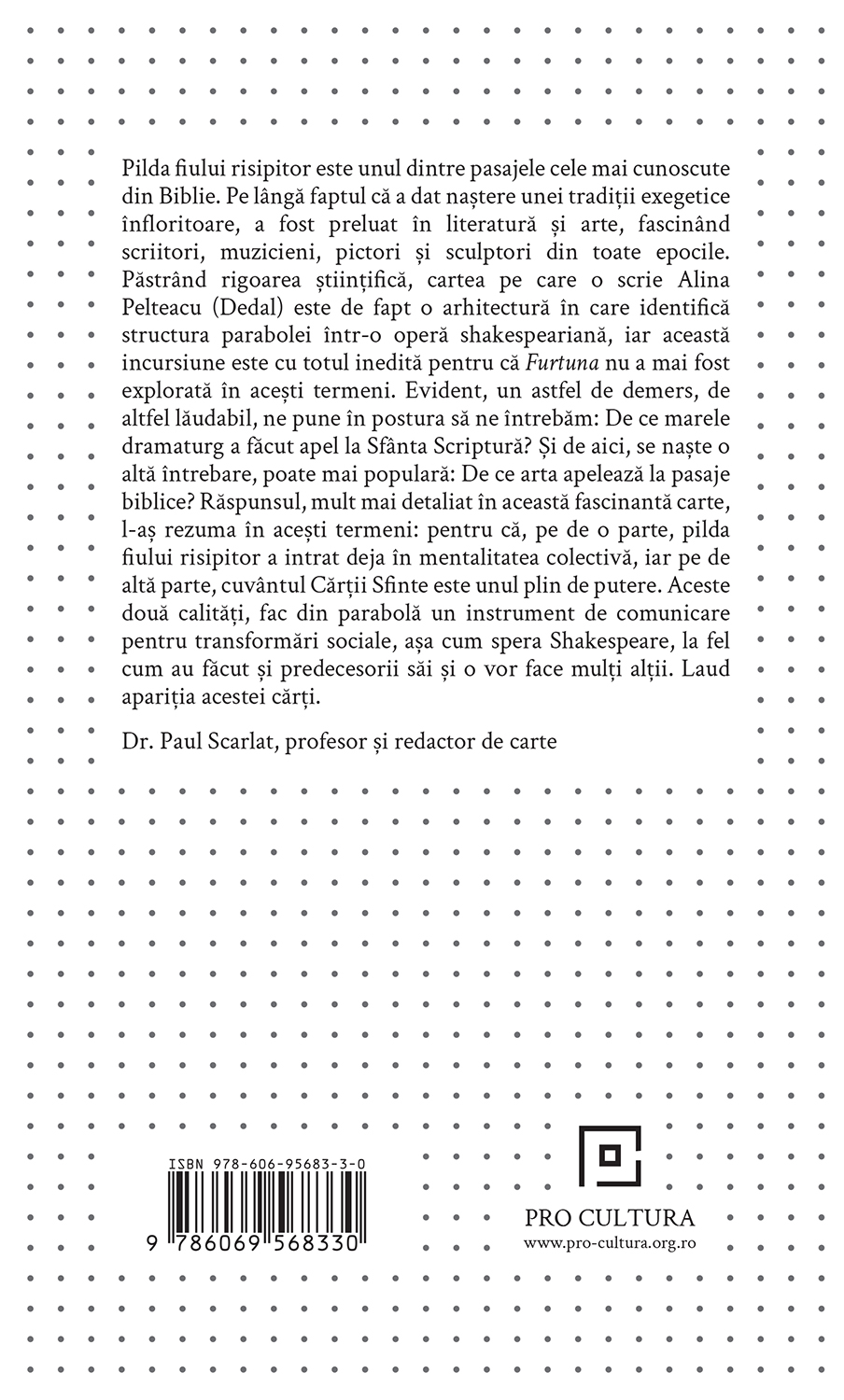 Parabola fiului risipitor este unul dintre pasajele cele mai cunoscute din Biblie. Pe lângă faptul că a dat naștere unei tradiții exegetice înfloritoare, a fost preluat în literatură și arte, fascinând scriitori, muzicieni, pictori și sculptori din toate epocile. Păstrând rigoarea științifică, această carte identifică structura parabolei în piesa lui William Shakespeare Furtuna, într-o incursiune cu totul inedită. De ce marele dramaturg a făcut apel la Sfânta Scriptură? De ce arta în general apelează la pasaje biblice? Pentru că, pe de o parte, pilda fiului risipitor a intrat deja în mentalitatea colectivă, iar pe de altă parte, textul scripturistic este unul plin de putere. Aceste două calități, fac din parabolă un instrument de comunicare pentru transformări sociale, așa cum spera Shakespeare, la fel cum au făcut și predecesorii săi și o vor face mulţi alții.