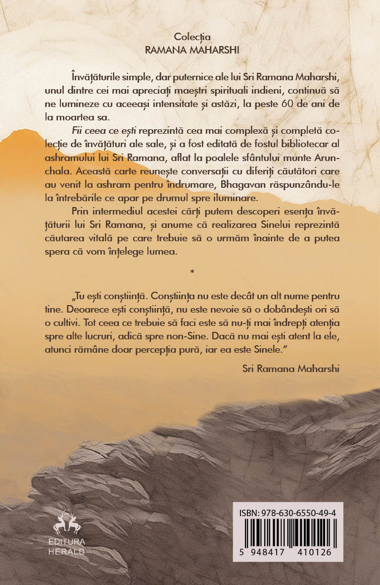 Fii ceea ce esti reprezinta cea mai complexa si completa colectie a intelepciunii sale, editata de fostul bibliotecar al ashramului lui Sri Ramana, aflat la poalele sfantului munte Arunachala. Aceasta carte reuneste conversatii cu diferiti cautatori care au venit la ashram pentru indrumare, Bhagavan raspunzand la intrebarile ce apar pe drumul spre iluminare.