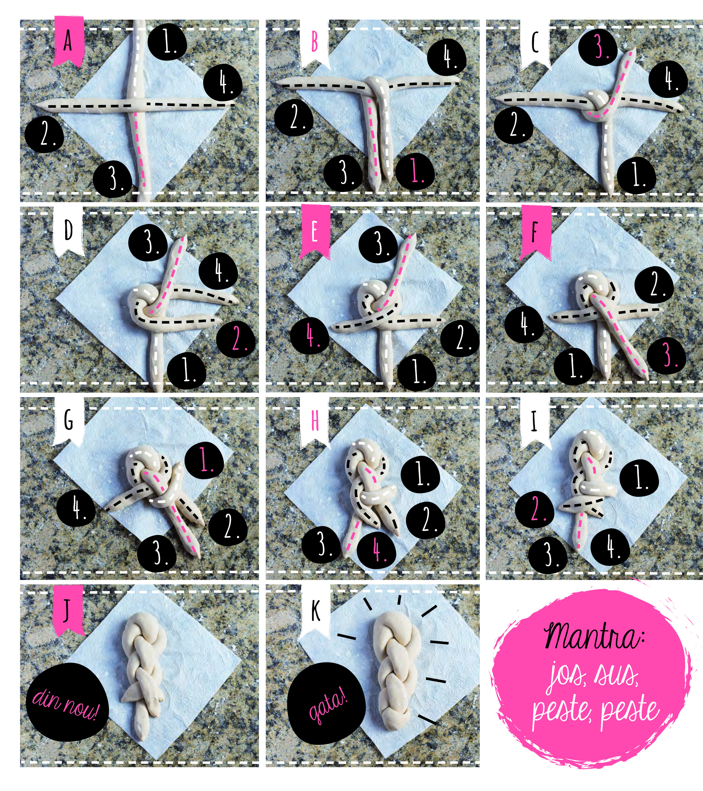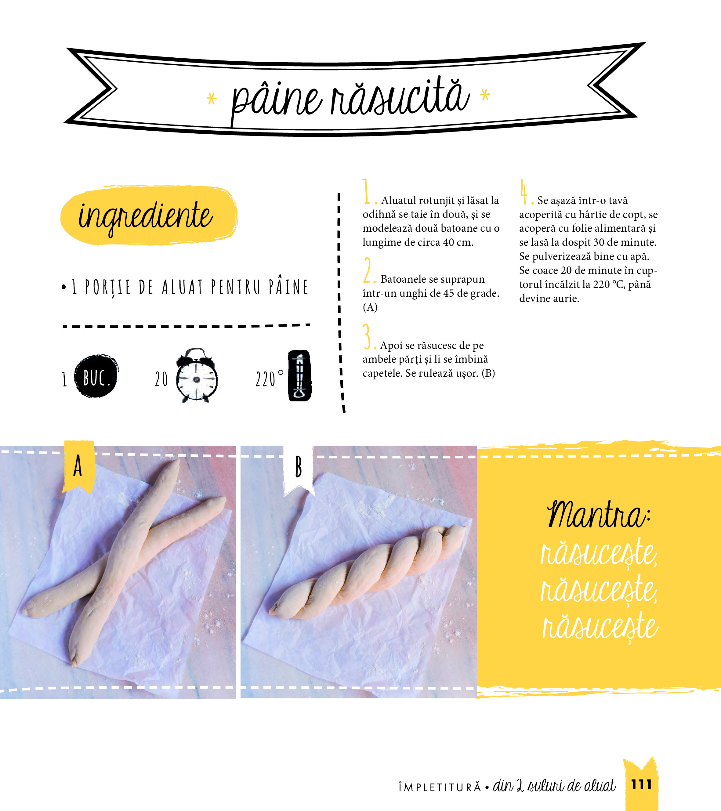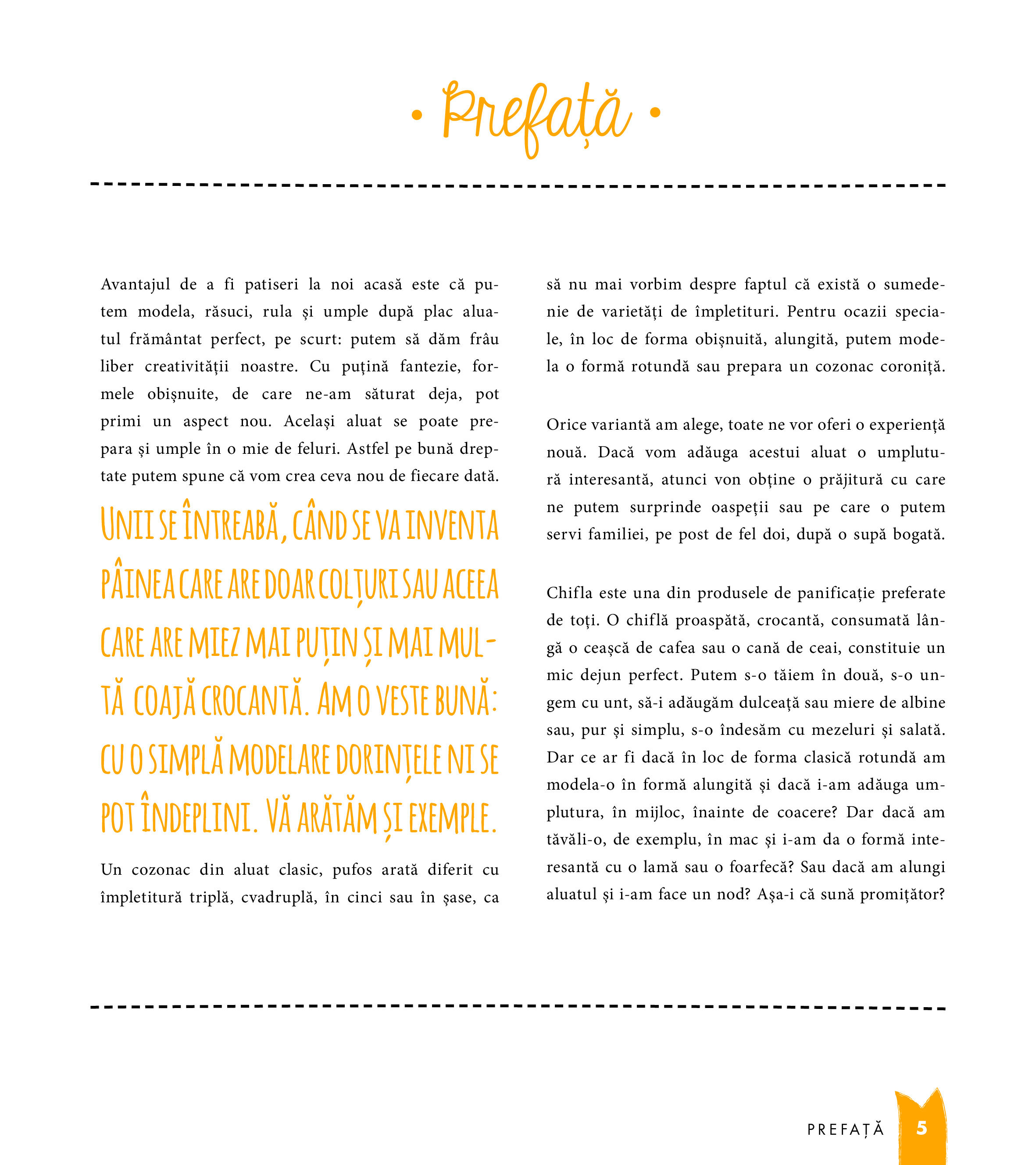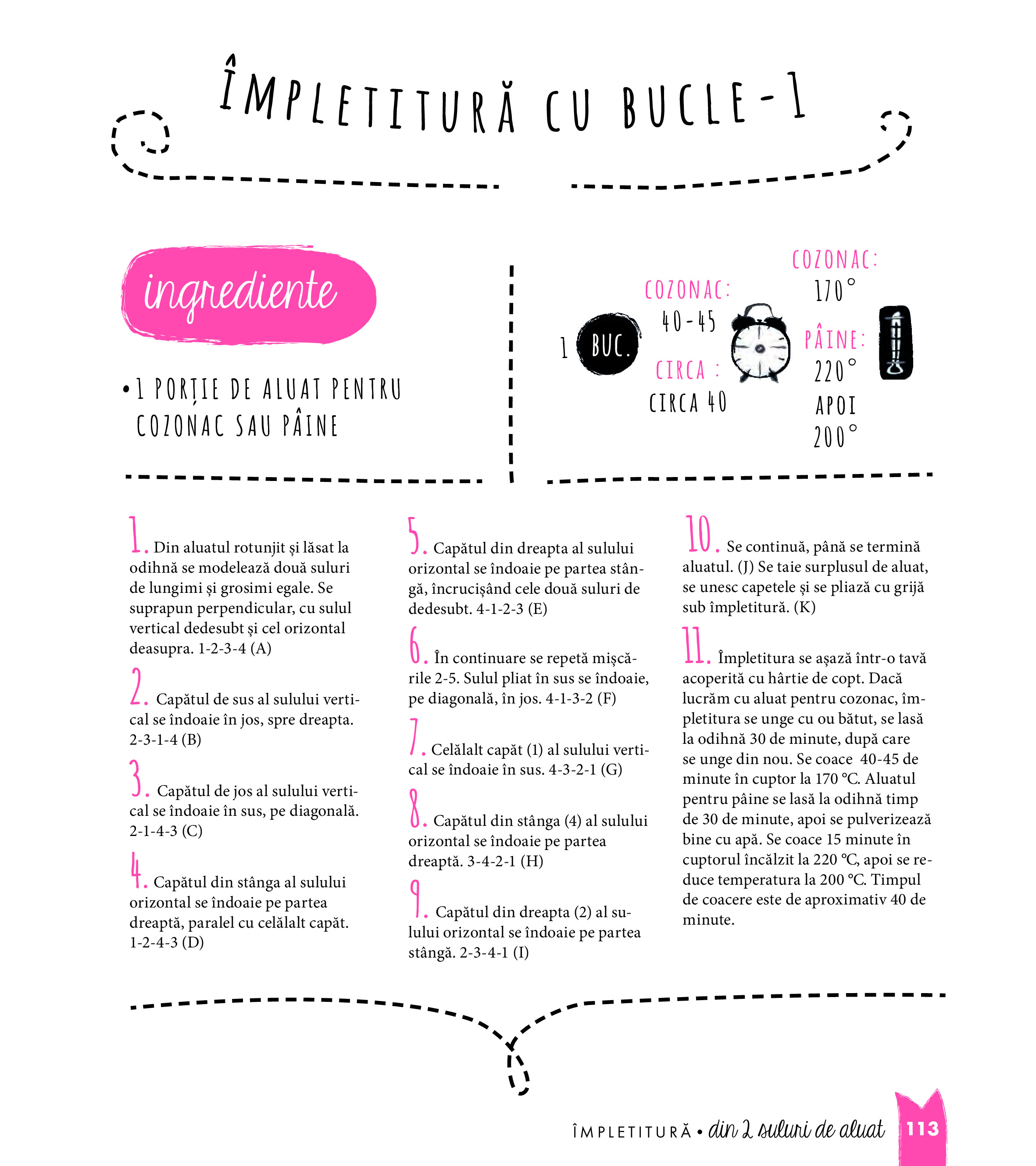 În carte găsim de toate: aluaturi, umpluturi dulci și sărate, creme ornate cu nori de zahăr praf și, nu în ultimul rând, împletituri grozave care schimbă aspectul și, de ce nu, și gustul produselor de patiserie cu care am fost obișnuiți. Ne putem impresiona familia și cunoștințele cu o pâine challah minunat împletită sau cu un cozonac dublu răsucit, umplut cu cremă dulce de brânză, ori cu o pâine cu coajă crocantă și cu mai multe colțuri ca de obicei... Pentru cei mici putem prepara crenvurști înveliți în aluat sau deghizați în purceluși ori, după o excursie în pădure, putem pregăti împreună chifle-con.