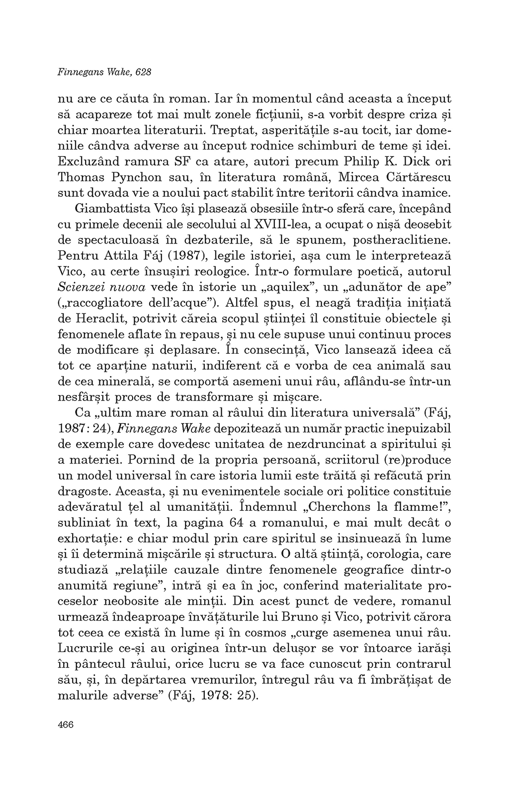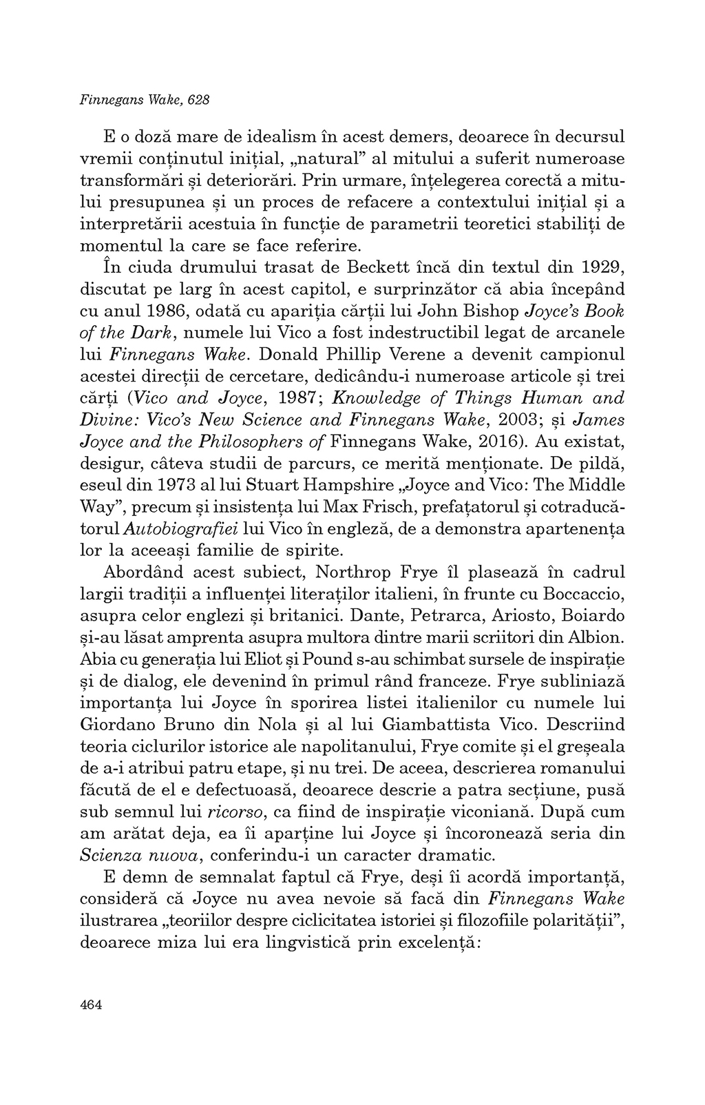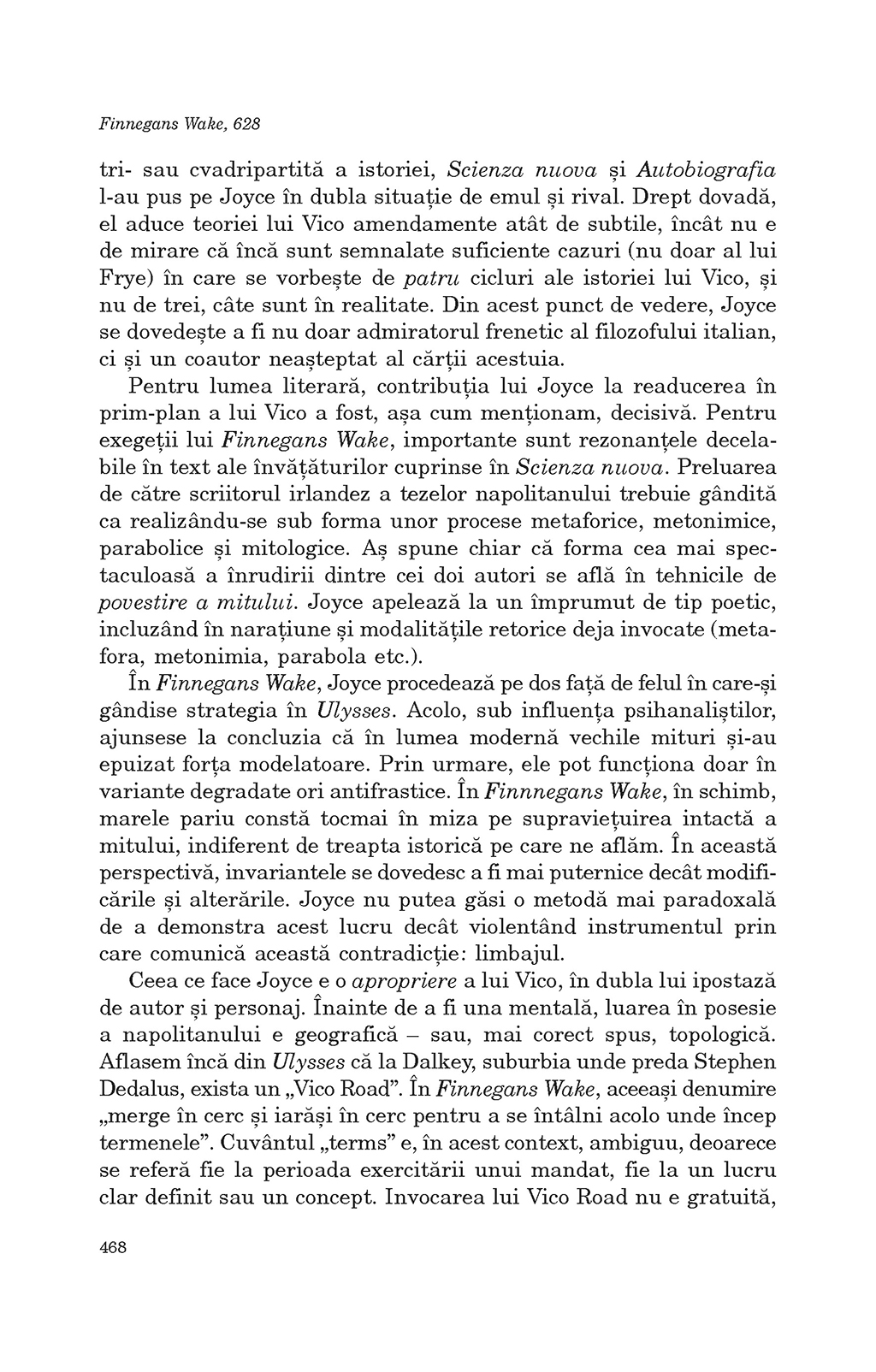 Finnegans Wake nu e doar groparul întregii literaturi de până la el, ci şi o casă de naşteri în care îşi aşteaptă venirea pe lume noile forme de exprimare a perplexităţii omului în faţa destinului. Pe un ton zeflemitor, Joyce retrimite arta la etern-ambarasanta dilemă a fi sau a nu fi. Răspunsul provizoriu se traduce în logica circulară care-i domină cartea: nu se poate să nu mai fii, din moment ce ai fost, chiar dacă la un moment dat s-a întâmplat să nu mai fii...” (Mircea Mihăieş)
