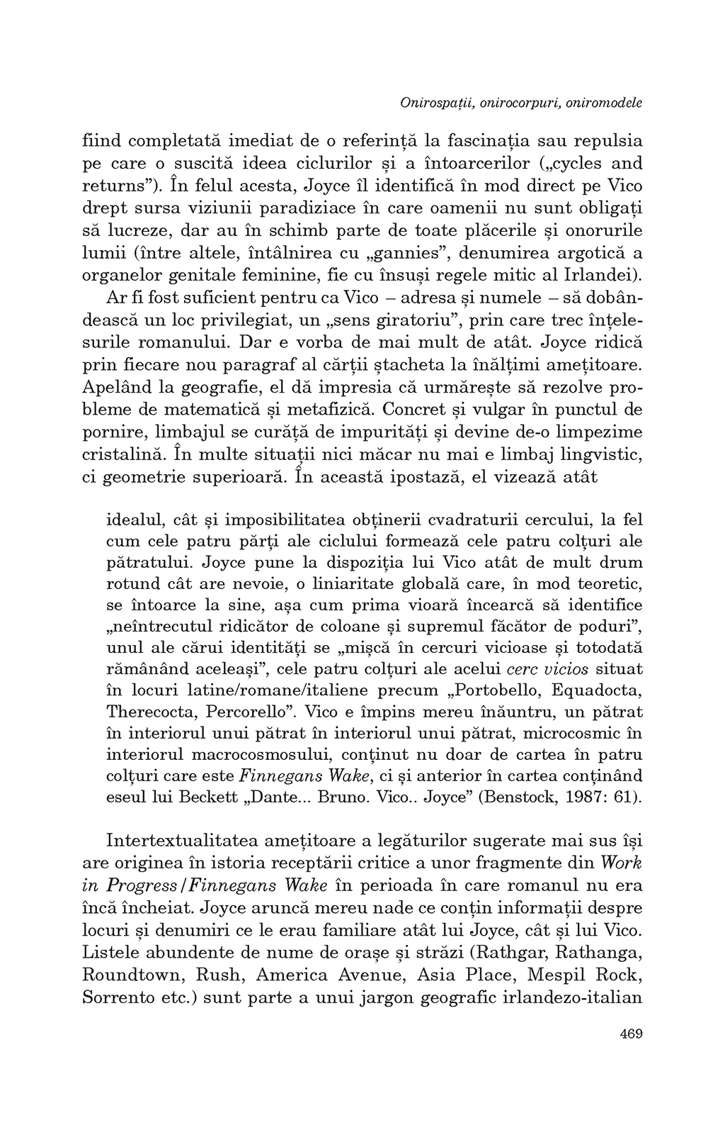 Cartea lui James Joyce se bazează pe un procedeu de recreare mentală a unor situaţii inaccesibile altfel decât prin observarea felului în care funcţionează mintea. Din acest motiv, metoda de lectură pe care am adoptat-o, mai degrabă intuitiv decât printr-un proces raţional, e aceea concentrată pe cuvânt. E tehnica maşinii de cusut, care străpunge materialul şi, totodată, îl leagă, prin ţesături dese, de fragmentul anterior şi de cel ulterior.