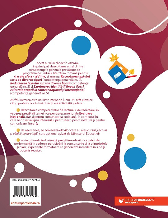 Acest auxiliar didactic vizează, în principal, dezvoltarea a trei dintre competențele generale prevăzute de programa de limba și literatura română pentru clasele a V-a – a VIII-a, și anume: Receptarea textului scris de diverse tipuri (competența generală nr. 2), Redactarea textului scris de diverse tipuri (competența generală nr. 3) și Exprimarea identității lingvistice și culturale proprii în context național și internațional (competența generală nr. 5).