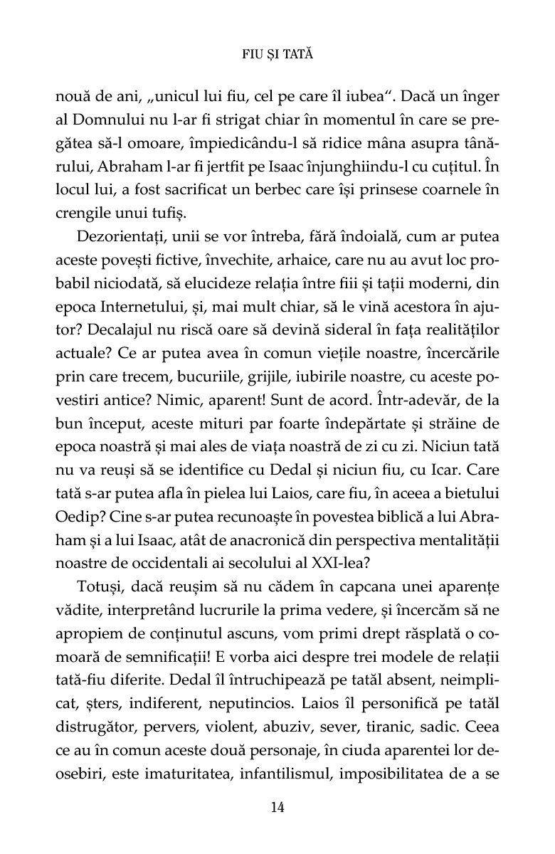 Asistăm la trei modele de relații diferite: Dedal întruchipează tatăl absent, neimplicat, șters, indiferent, neputincios. Laios îl personifică pe tatăl distrugător, pervers, violent, abuziv, sever, tiranic, sadic. În ceea ce‑l privește pe Avraam, el este singurul care se străduiește să‑l protejeze pe Isaac, eliberându‑se de atotputernicia soției sale.