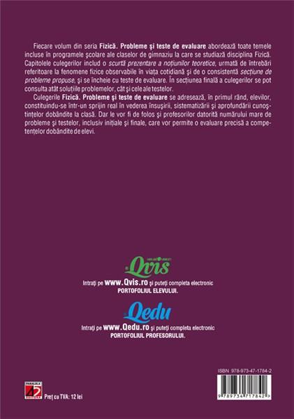 Culegerile Fizica. Probleme si teste de evaluare se adreseaza, in primul rand, elevilor, constituindu-se intr-un sprijin real in vederea insusirii, sistematizarii si aprofundarii cunos-tintelor dobandite la clasa. Dar le vor fi de folos si profesorilor datorita numarului mare de probleme si testelor, inclusiv initiale si finale, care vor permite o evaluare precisa a competentelor dobandite de elevi.