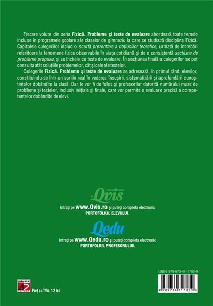 Culegerile Fizica. Probleme si teste de evaluare se adreseaza, in primul rand, elevilor, constituindu-se intr-un sprijin real in vederea insusirii, sistematizarii si aprofundarii cunos-tintelor dobandite la clasa. Dar le vor fi de folos si profesorilor datorita numarului mare de probleme si testelor, inclusiv initiale si finale, care vor permite o evaluare precisa a competentelor dobandite de elevi.