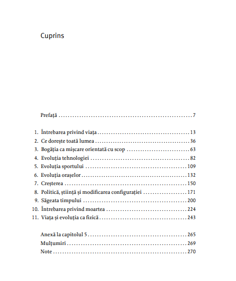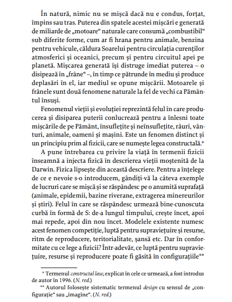 Ce anume au în comun fenomene cum sunt evoluția vieții, a tehnologiei, a bazinelor riverane, a orașelor, a culturii sau a sporturilor? În ultimă instanță, care e legătura profundă dintre dinamica domeniului însuflețit și cea a domeniului neînsuflețit? La aceste întrebări răspunde profesorul Adrian Bejan de la Universitatea Duke, pornind de la concepte din fizică și bazân-du-se pe legea constructală, pe care a impus-o atenției comunității științifice. În explicațiile sale, accentul cade pe libertatea de mișcare și transformare, pe configurațiile de curgere ale diferitelor sisteme și modificările lor, pe tendințe naturale prezente atât în lumea vie, cât și în cea nevie. Din această perspectivă, evoluția devine un fenomen mult mai vast decât ne lasă să înțelegem doar studiul biologiei. Legea constructală are consecințe importante deopotrivă în plan practic (dezvoltarea economică și urbană, aprovizionarea cu apă și combustibil, tehnologie, societate, politică) și în plan teoretic, prin gradul ei înalt de generalitate. Cartea lui Adrian Bejan e un tur de forță intelectual.