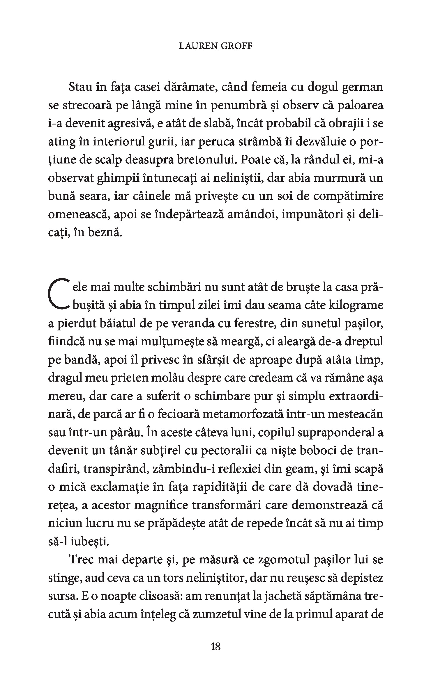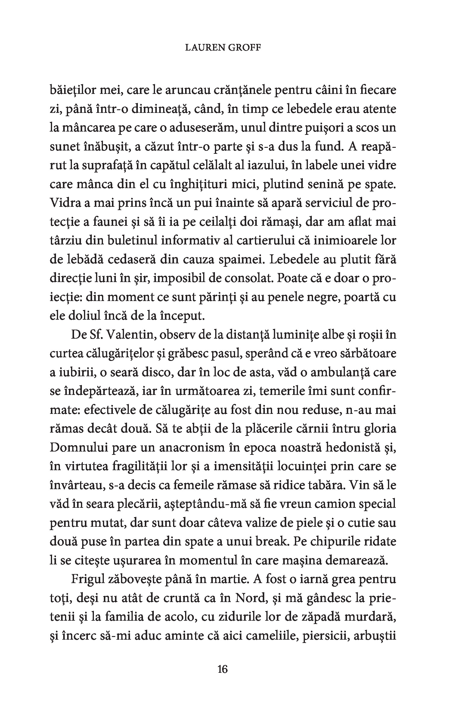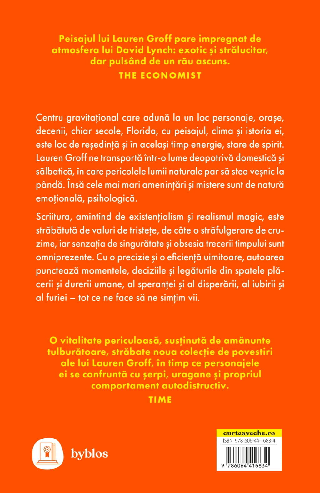 Lauren Groff ne transportă într-o lume deopotrivă domestică și sălbatică, în care pericolele lumii naturale par să stea veșnic la pândă. Însă cele mai mari amenințări și mistere sunt de natură emoțională, psihologică.