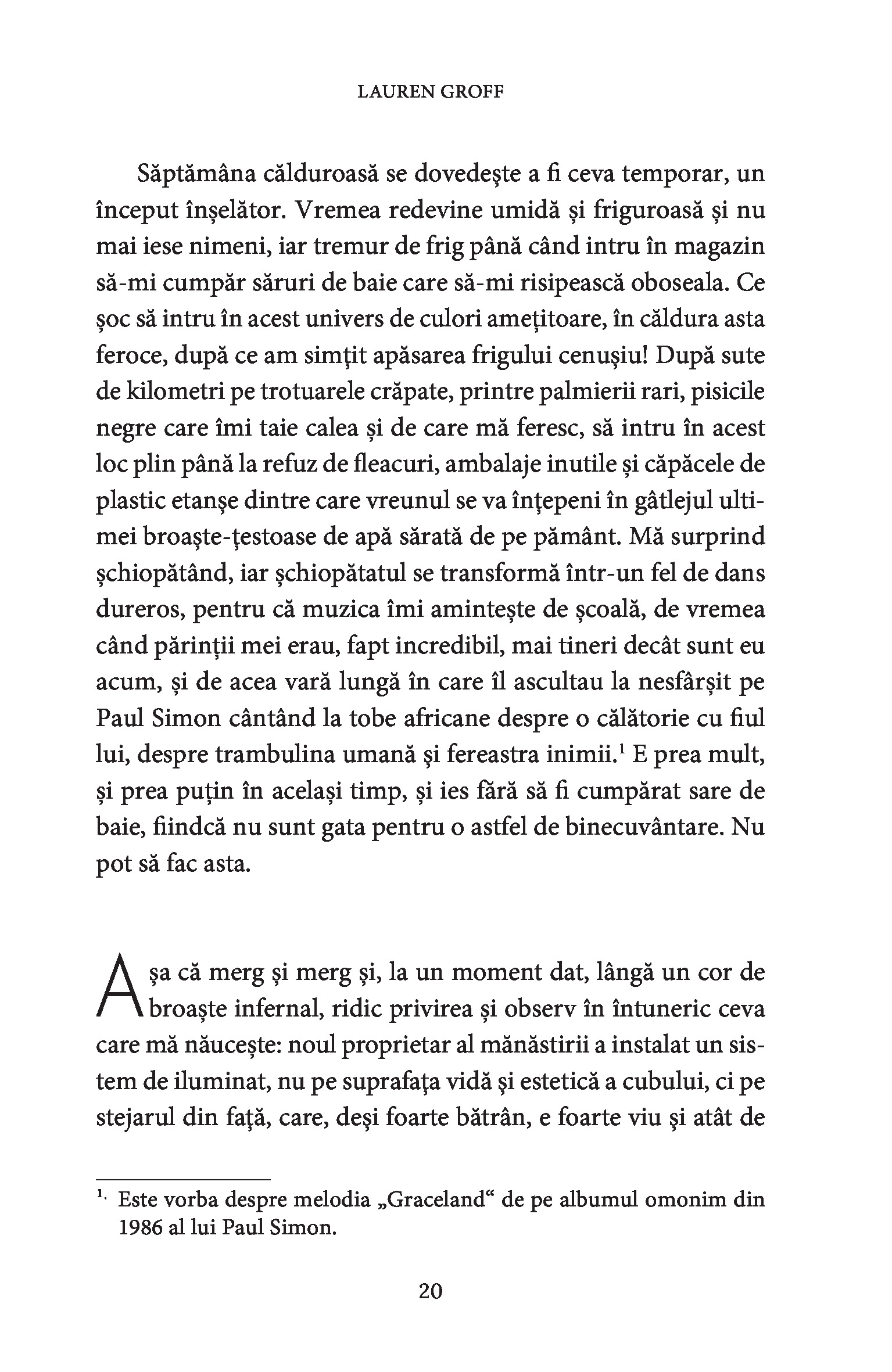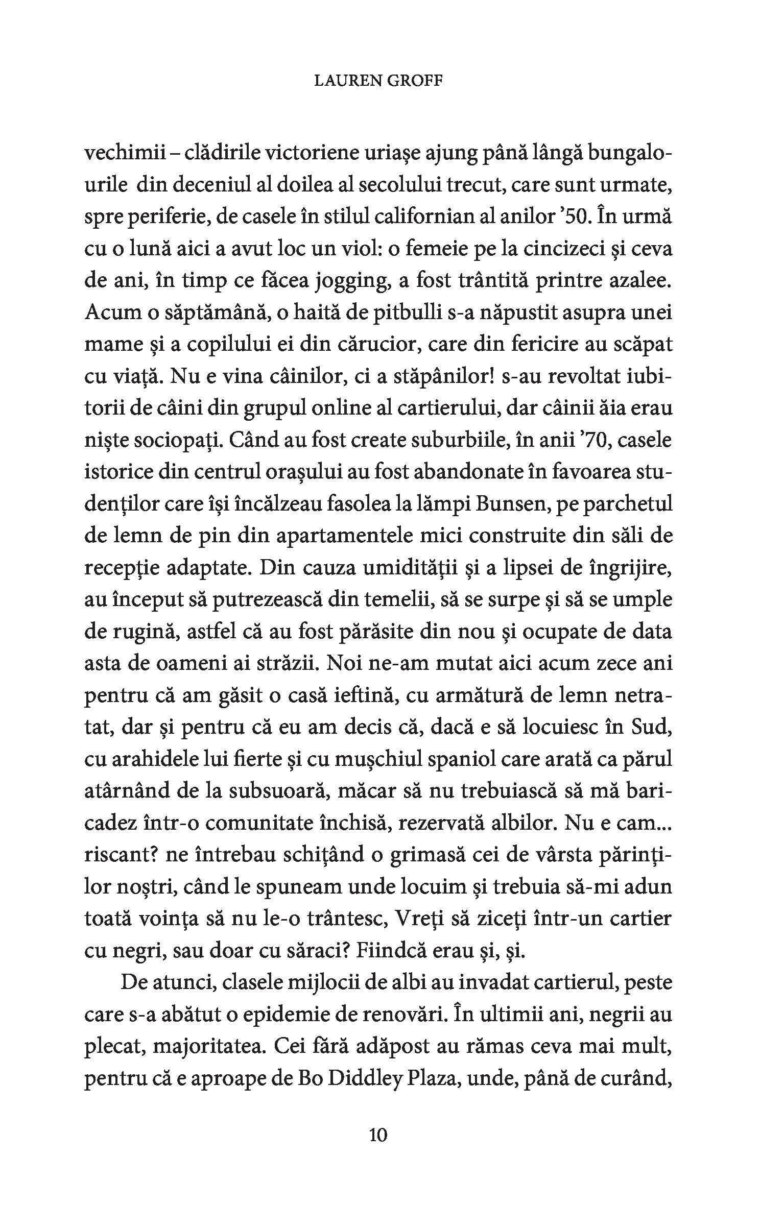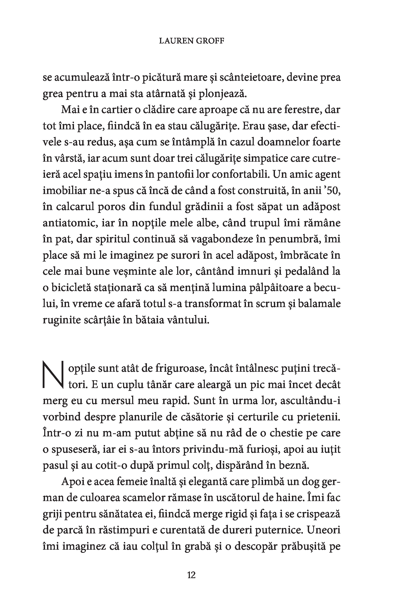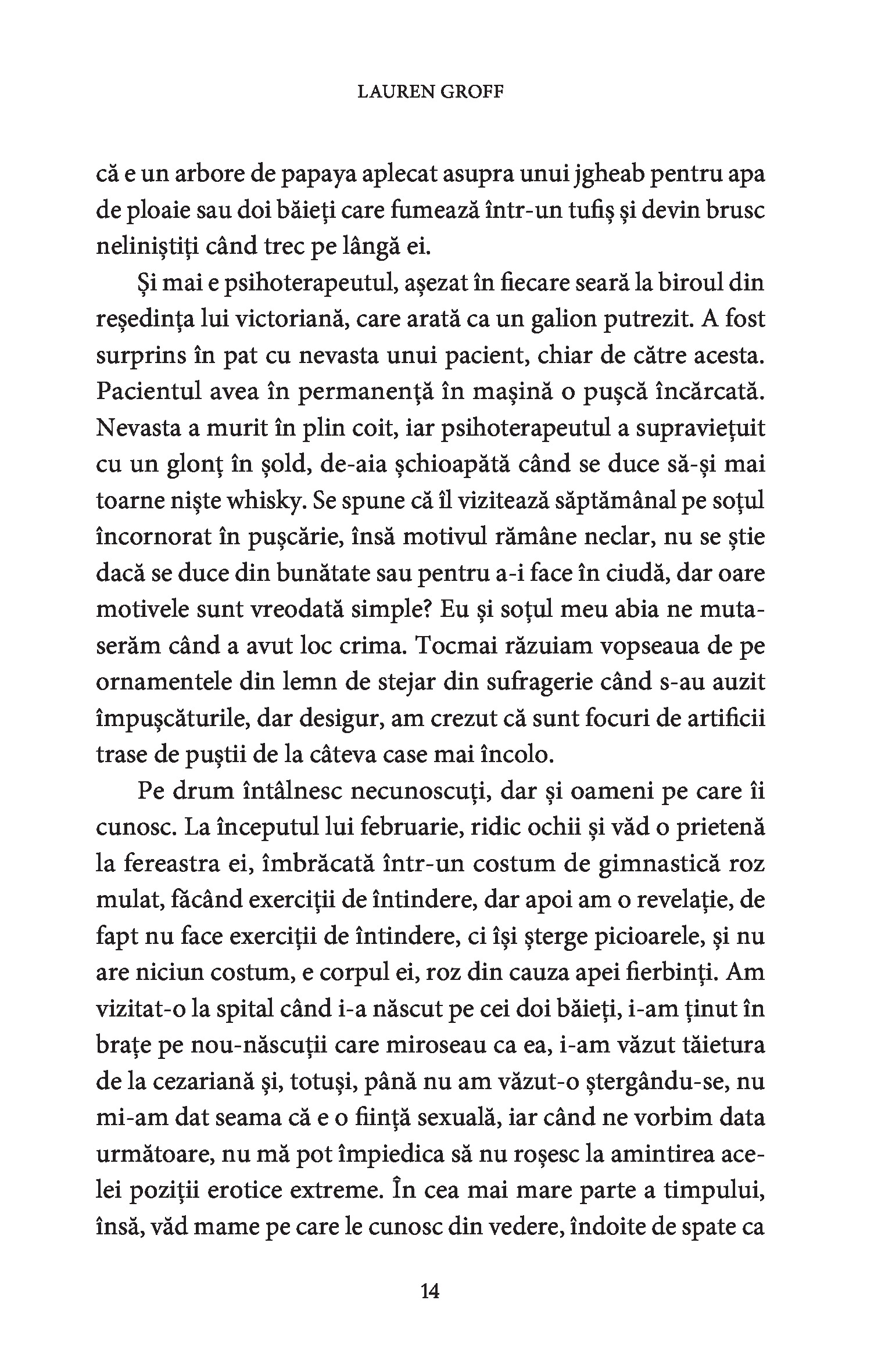 Lauren Groff ne transportă într-o lume deopotrivă domestică și sălbatică, în care pericolele lumii naturale par să stea veșnic la pândă. Însă cele mai mari amenințări și mistere sunt de natură emoțională, psihologică.