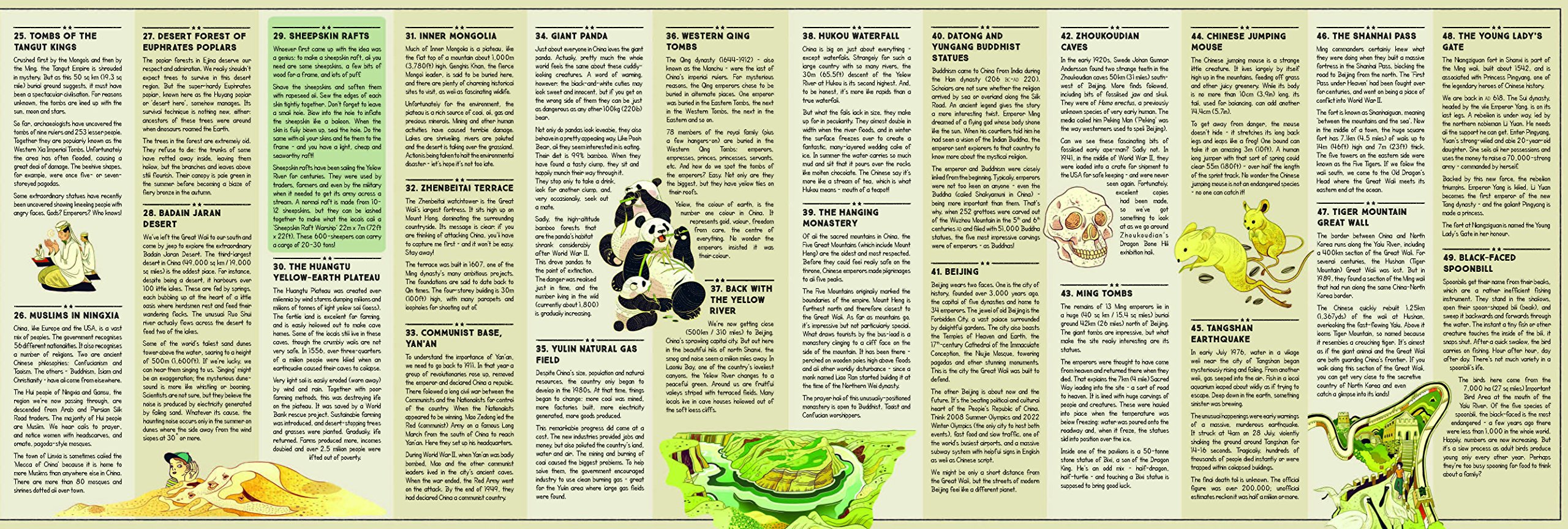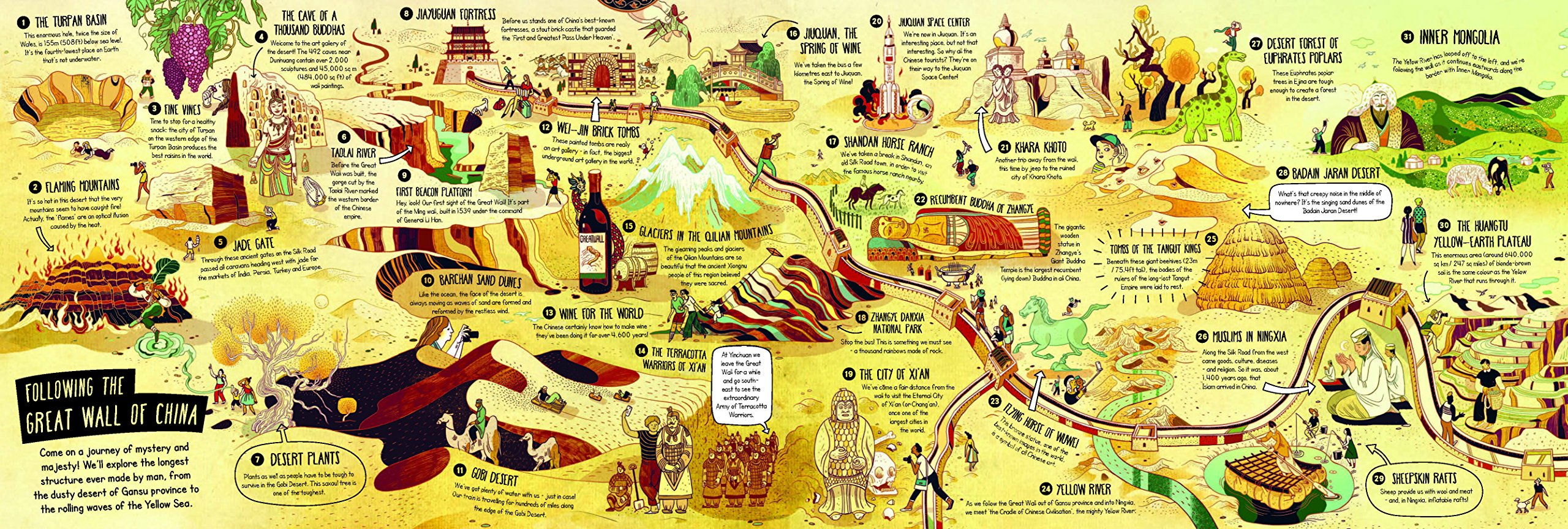 Get ready for an unforgettable journey across China. From the dusty desert of Gansu province to the rolling waves of the Yellow Sea, this amazing journey takes you past flaming mountains and ancient wonders. Watch out for mighty fortresses, giant pandas and the extraordinary Army of Terracotta Warriors. Along the way we'll discover breathtaking wonders of nature, visit modern China and see how the traditions and landscape of the Great Wall are changing, explore fascinating ancient Chinese monuments, treasures and legends, encounter some of the amazing creatures living near the Great Wall, and lots more! With stunning illustrated detail on one side and engaging facts on the other - get ready for a truly unforgettable journey!