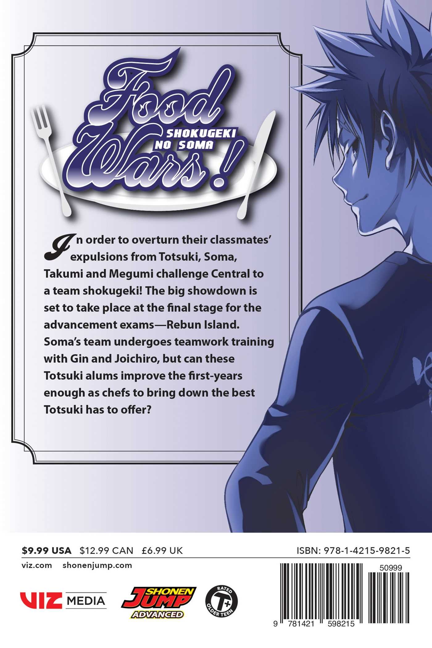 In order to overturn their classmates’ expulsions from Totsuki, Soma, Takumi and Megumi challenge Central to a team shokugeki! The big showdown is to take place at the final stage for the advancement exams—Rebun Island. Soma’s team undergoes teamwork training with Gin and Joichiro. But can these Totsuki alums improve the first-years enough as chefs to bring down the best Totsuki has to offer?