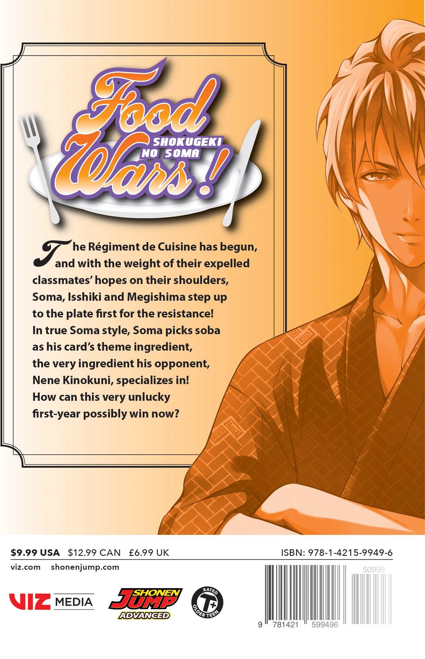 The Regiment du Cuisine has begun, and with the weight of their expelled classmates’ hopes on their shoulders, Soma, Isshiki and Megishima step up to the plate first for the resistance! In true Soma style, Soma picks soba as his card’s theme ingredient, the very ingredient his opponent, Nene Kinokuni, specializes in! How can this very unlucky first-year possibly win now?