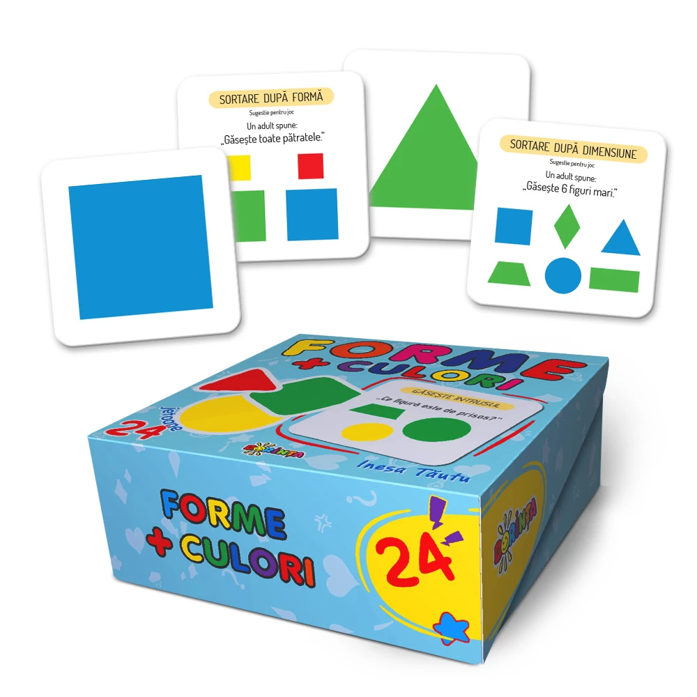 Un set educativ și distractiv care îi ajută pe cei mici să recunoască și să numească figurile geometrice și culorile într-un mod vizual și interactiv.