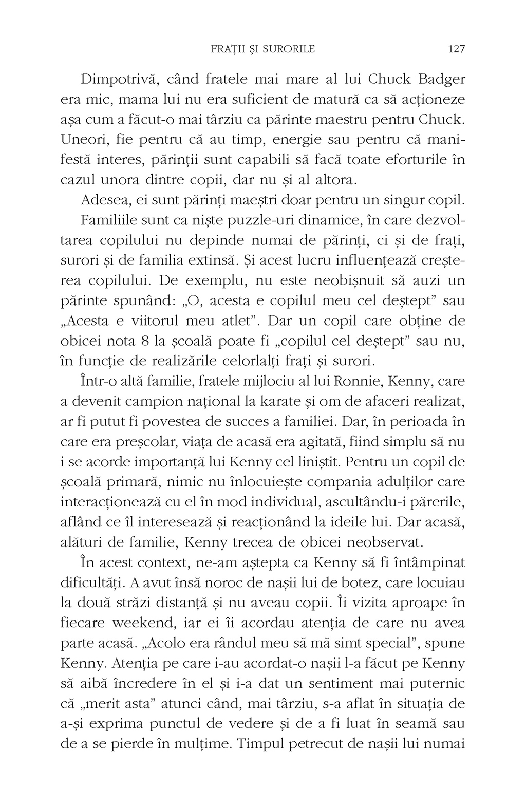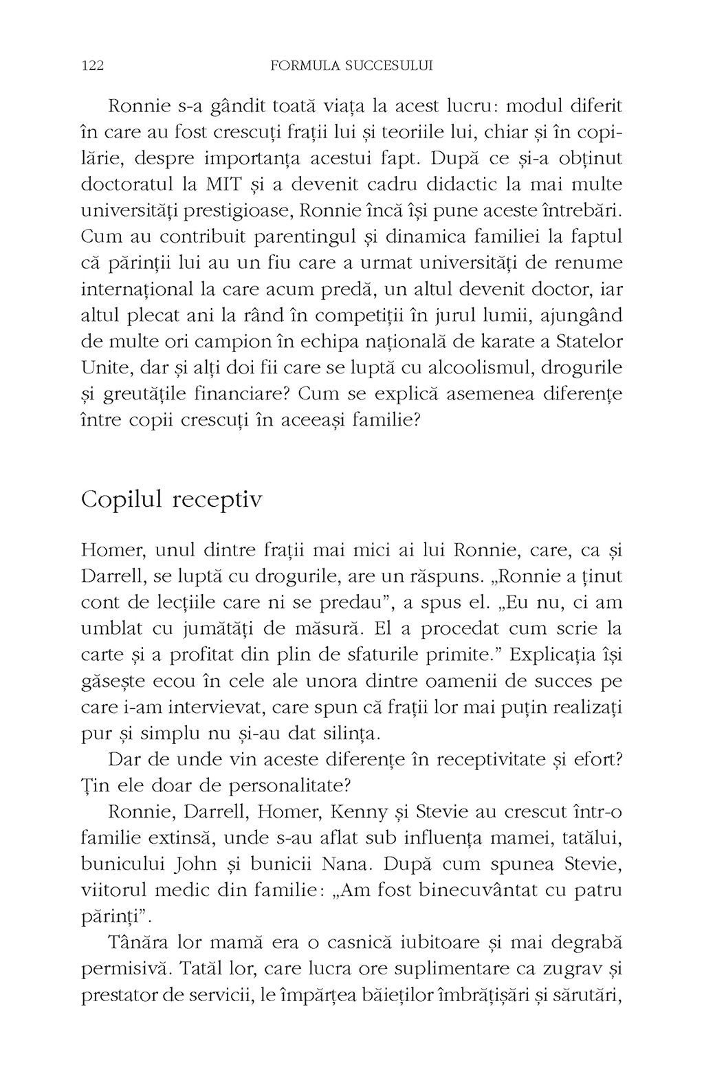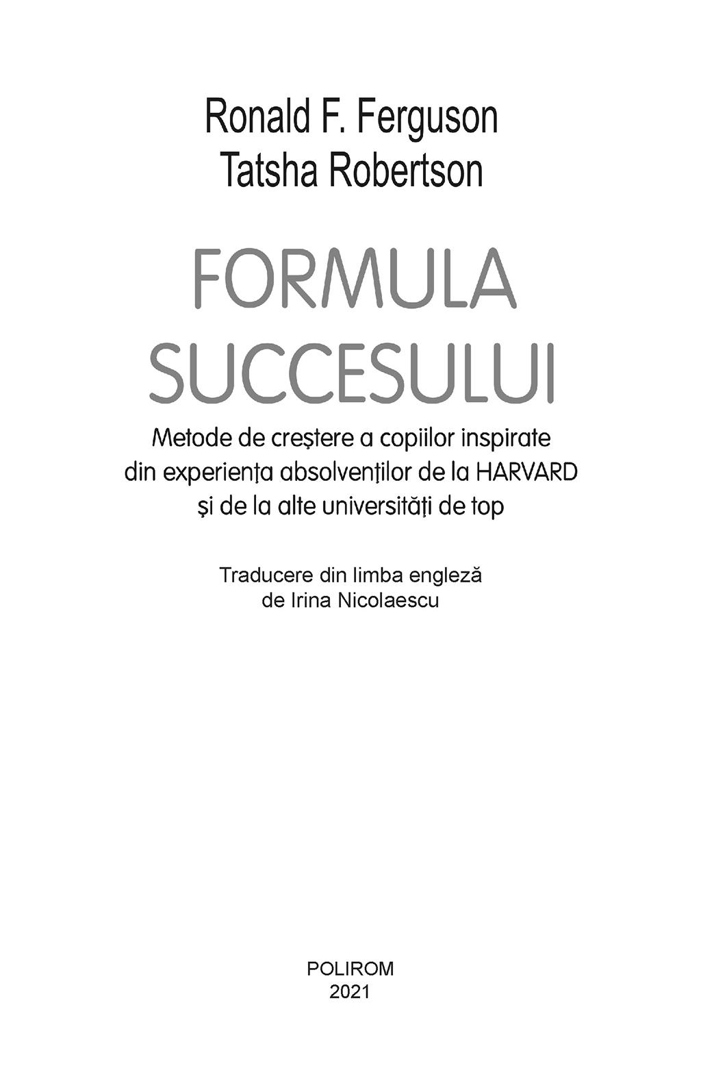 De ce, pentru unii, succesul pare să vină atît de ușor? Există o formulă de parenting care să creeze cu certitudine adulți remarcabili și realizați? Bazată pe cele mai recente cercetări științifice, cartea de față îți arată că, încă de la nașterea copilului tău, deciziile în ce privește creșterea lui pot avea o influență fundamentală. În urma unor interviuri desfășurate pe parcursul a 15 ani cu 200 de studenți de la Harvard sau de la alte universități prestigioase, precum și cu unii dintre părinții lor, autorii au descoperit că pot fi descrise opt tipare în care se încadrează stilurile de parenting, ce nu au nicio legătură cu mediul din care provin părinții, cu naționalitatea sau cu rasa lor, ba chiar, în majoritatea cazurilor, nici măcar cu nivelul lor de educație. Aceste stiluri de parenting pot fi învățate de orice părinte sau educator interesat, astfel încît, chiar dacă nu toți copiii vor deveni muzicieni celebri, absolvenți de Harvard sau oameni de afaceri bogați, formula succesului le va îmbunătăți cu siguranță rezultatele la școală și șansele de a avea o viață fericită și plină de sens.