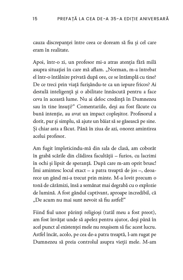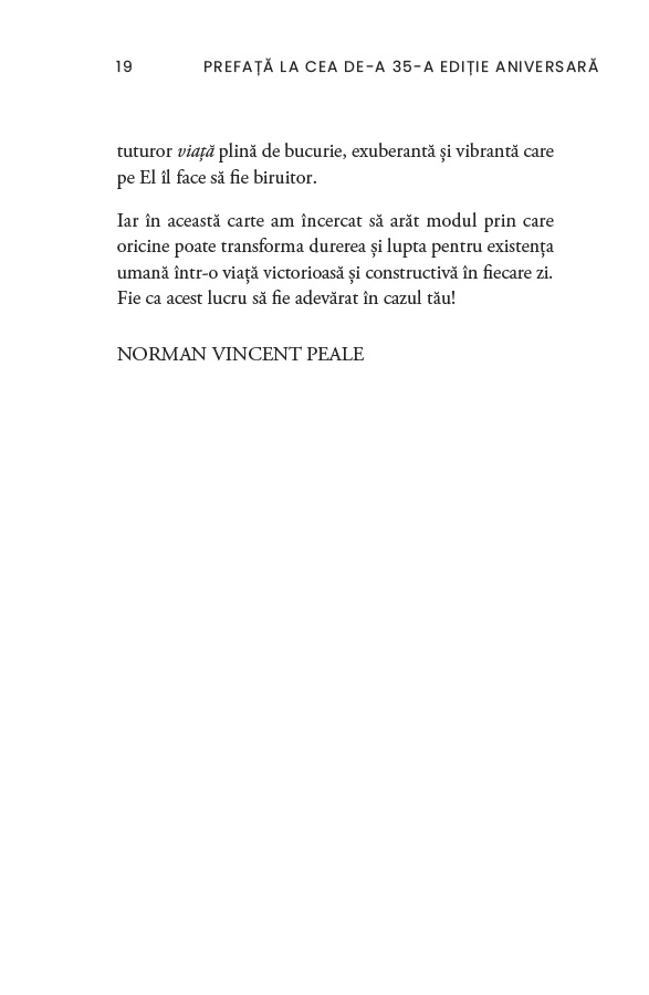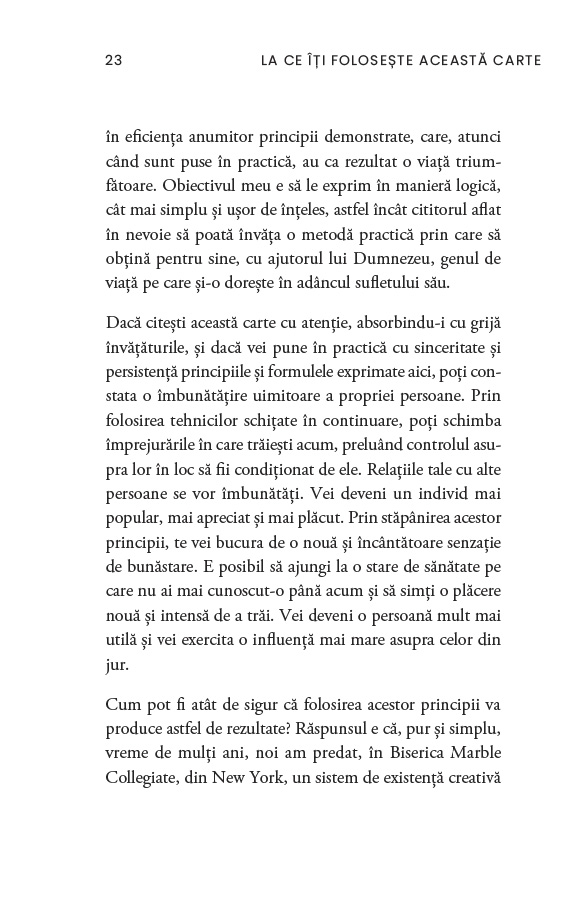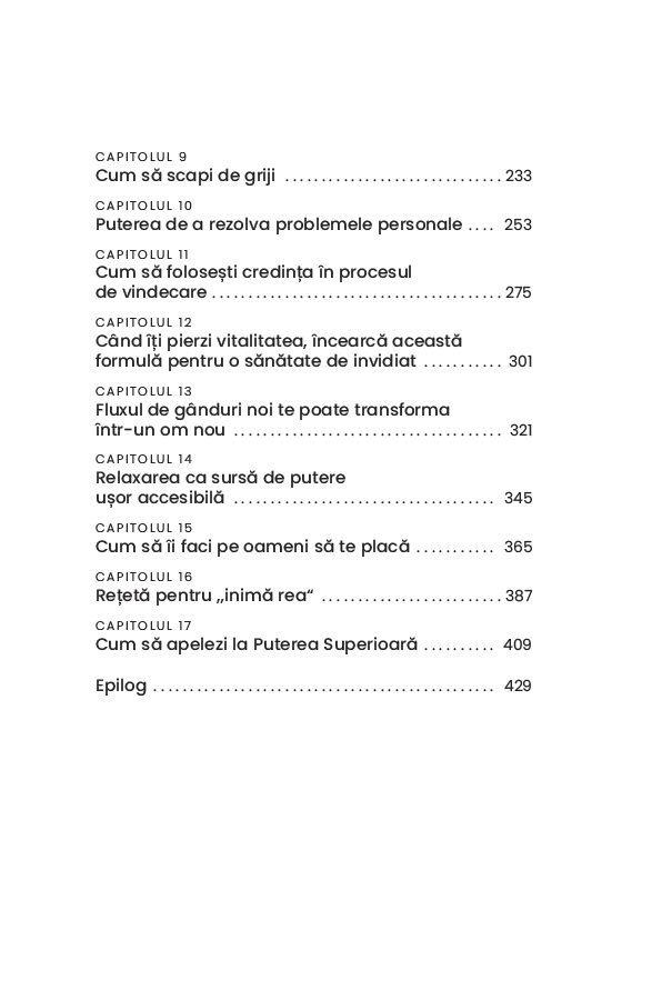 Tehnicile prezentate de N.V. Peale – unul dintre cei mai mari oratori creștini ai secolului al XX-lea și teolog de renume mondial, specializat în probleme motivaționale – te vor ajuta să aduci un plus de energie în viața ta și să dobândești impulsul de care ai nevoie pentru a-ți elibera resursele interioare și a-ți îndeplini toate dorințele.