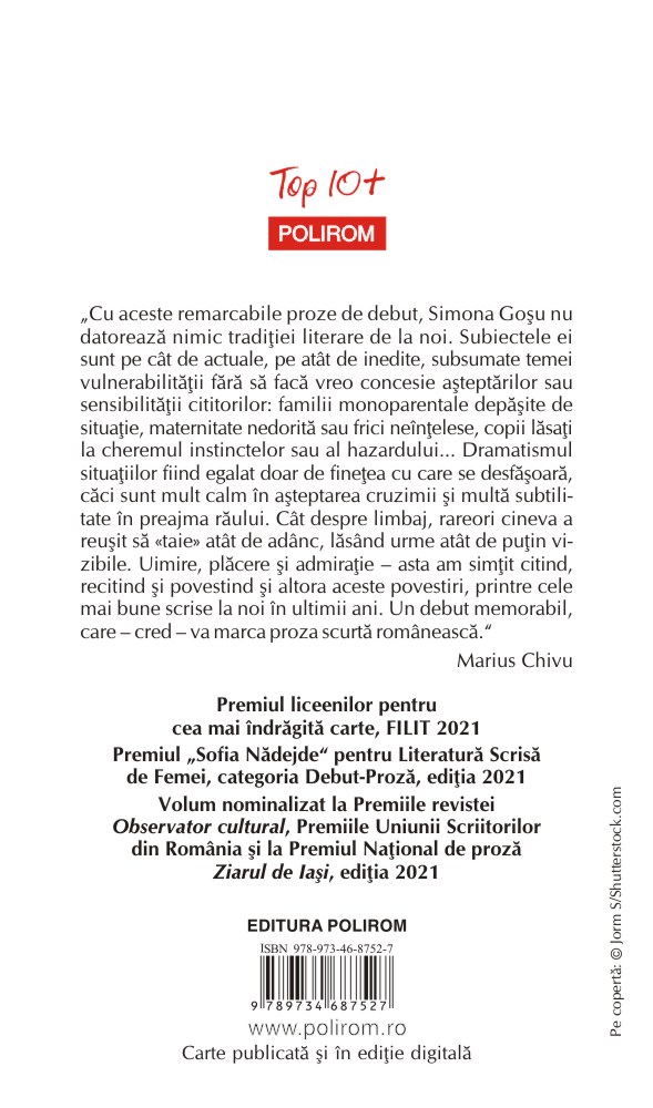 „Cu aceste remarcabile proze de debut, Simona Goşu nu datorează nimic tradiţiei literare de la noi. Subiectele ei sunt pe cât de actuale, pe atât de inedite, subsumate temei vulnerabilităţii fără să facă vreo concesie aşteptărilor sau sensibilităţii cititorilor: familii monoparentale depăşite de situaţie, maternitate nedorită sau frici neînţelese, copii lăsaţi la cheremul instinctelor sau al hazardului... Dramatismul situaţiilor fiind egalat doar de fineţea cu care se desfăşoară, căci sunt mult calm în aşteptarea cruzimii şi multă subtilitate în preajma răului. Cât despre limbaj, rareori cineva a reuşit să «taie» atât de adânc, lăsând urme atât de puţin vizibile. Uimire, plăcere şi admiraţie – asta am simţit citind, recitind şi povestind şi altora aceste povestiri, printre cele mai bune scrise la noi în ultimii ani. Un debut memorabil, care – cred – va marca proza scurtă românească.” (Marius Chivu)