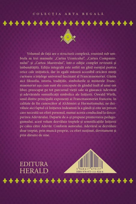 Gasim aici filosofia, istoria, traditiile, simbolurile si misterele Francmasoneriei asa cum sunt ele concepute de gandul inalt al unui om liber, preocupat pe tot parcursul vietii sale sa gaseasca Adevarul si adevaratele semnificatii simbolice ale Initierii. Oswald Wirth, unul dintre principalii exponenti ai Francmasoneriei franceze, in calitate de fin cunoscator al Alchimiei si Hermetismului, ne dezvaluie aici faptul ca Initierea indeamna la a gandi si este un proces care necesita un efort personal, numai acesta conducand la descoperirea Adevarului. Departe de a-si propune promovarea pedagogismului, acest volum dezvaluie treptele si semnificatiile Initierii pe calea catre Adevar. Conform autorului, Adevarul se dezvaluie doar treptat, prin munca proprie, cu efort sustinut, devotament si prin daruire de sine.