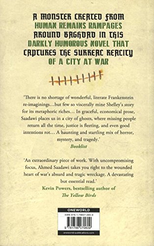 From the rubble-strewn streets of US-occupied Baghdad, the scavenger Hadi collects human body parts and stitches them together to create a corpse. His goal, he claims, is for the government to recognize the parts as people and give them a proper burial. But when the corpse goes missing, a wave of eerie murders sweeps the city, and reports stream in of a horrendous-looking criminal who, though shot, cannot be killed. Hadi soon realises he has created a monster, one that needs human flesh to survive – first from the guilty, and then from anyone who crosses its path.