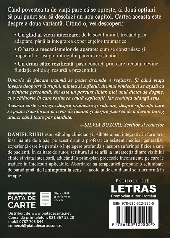 DANIEL RUSU este psiholog clinician si psihoterapeut integrativ in formare, insa inainte de a pasi pe acest drum a profesat ca asistent medical generalist, experienta care i-a permis o intelegere profunda si asupra suferintei fizice a sute de pacienti. Aceasta perspectiva dubla ii permite sa aduca rigoare si blandete pe aceeasi pagina. In calitate de autor, scriitura lui se afla la intersectia dintre vizibilul clinic si viata interioara, aducand in prim-plan procesele inconstiente pe care le traduce in intelesuri aplicabile.