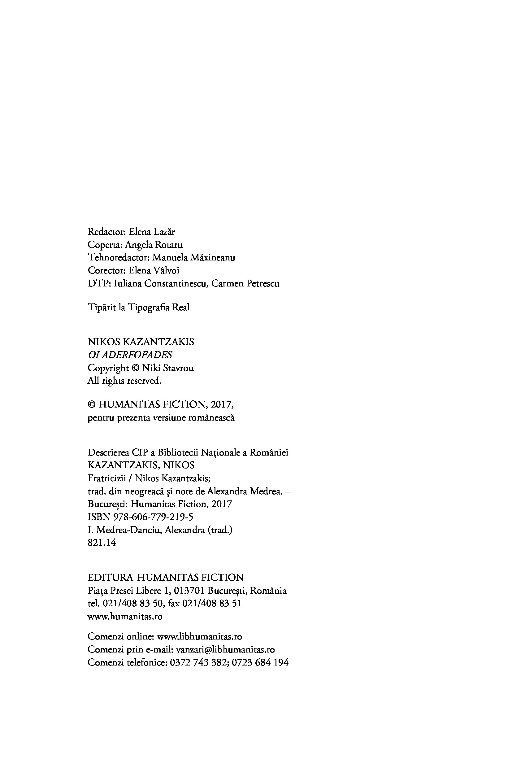 Martor la evenimentele dramatice care au zguduit țara sa din decembrie 1944 până în 1949, Kazantzakis începe să scrie Fratricizii în 1949, dându-i tușa finală în 1954. Temerea sa – „presimt că în Grecia nu se va publica decât mult mai târziu“ – s-a adeverit, ediția ateniană apărând abia în 1963. Tradus, cu multiple reeditări, în peste 20 de limbi, romanul păstrează același dramatism și aceeași vibrație specifice marilor opere ale titanului literaturii grecești, fiind cel mai aproape de lumea noastră, măcinată de lupte fratricide.