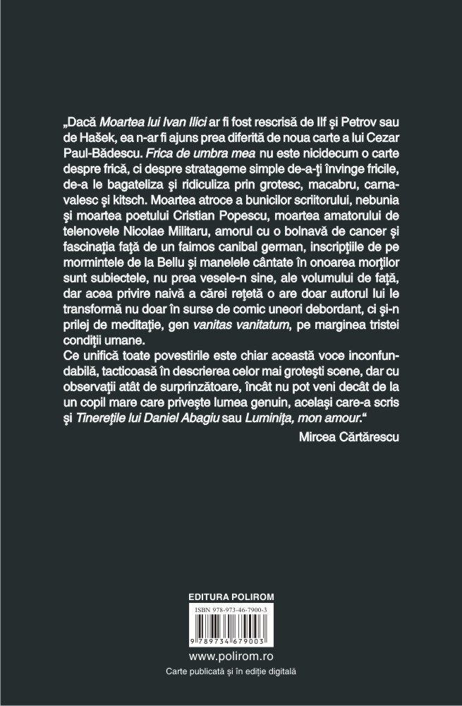„Dacă Moartea lui Ivan Ilici ar fi fost rescrisă de Ilf și Petrov sau de Hašek, ea n-ar fi ajuns prea diferită de noua carte a lui Cezar Paul-Bădescu. Frica de umbra mea nu este nicidecum o carte despre frică, ci despre stratageme simple de-a-ți învinge fricile, de-a le bagateliza și ridiculiza prin grotesc, macabru, carnavalesc și kitsch. Moartea atroce a bunicilor scriitorului, nebunia și moartea poetului Cristian Popescu, moartea amatorului de telenovele Nicolae Militaru, amorul cu o bolnavă de cancer și fascinația față de un faimos canibal german, inscripțiile de pe mormintele de la Bellu și manelele cîntate în onoarea morților sunt subiectele, nu prea vesele-n sine, ale volumului de față, dar acea privire naivă a cărei rețetă o are doar autorul lui le transformă nu doar în surse de comic uneori debordant, ci și-n prilej de meditație, gen vanitas vanitatum, pe marginea tristei condiții umane. Ce unifică toate povestirile este chiar această voce inconfundabilă, tacticoasă în descrierea celor mai grotești scene, dar cu observații atît de surprinzătoare, încît nu pot veni decît de la un copil mare care privește lumea genuin, același care-a scris și Tinerețile lui Daniel Abagiu sau Luminița, mon amour.” (Mircea Cărtărescu)