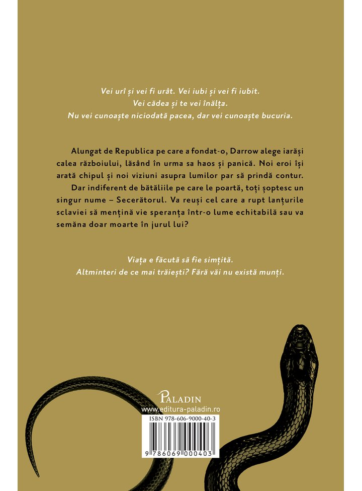 Alungat de Republica pe care a fondat-o, Darrow alege iarăși calea războiului, lăsând în urma sa haos și panică. Noi eroi își arată chipul și noi viziuni asupra lumilor par să prindă contur. Dar indiferent de bătăliile pe care le poartă, toți șoptesc un singur nume – Secerătorul. Va reuși cel care a rupt lanțurile sclaviei să mențină vie speranța într-o lume echitabilă sau va semăna doar moarte în jurul lui?