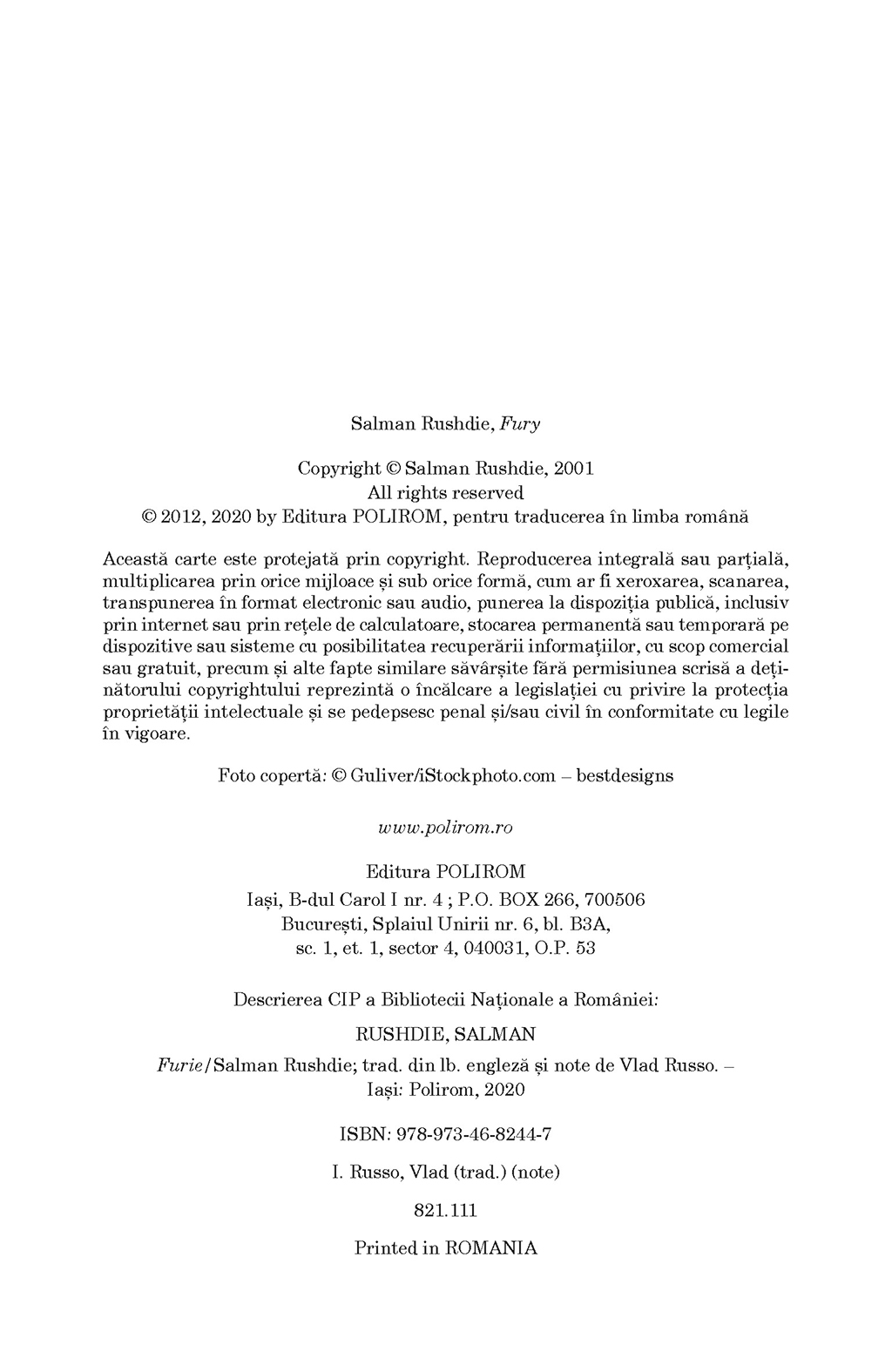 „Ca toate poveștile frumoase, Furie are și ea o morală, pentru care Rushdie explorează subiecte dificile, aducînd în discuție rasa sau clasa personajelor sale. Celebrul scriitor ne ajută să vedem viața americană prin ochii unui vizitator: dintr-odată, impresia pe care o avem despre noi se schimbă irevocabil.” (Houston Chronicle)