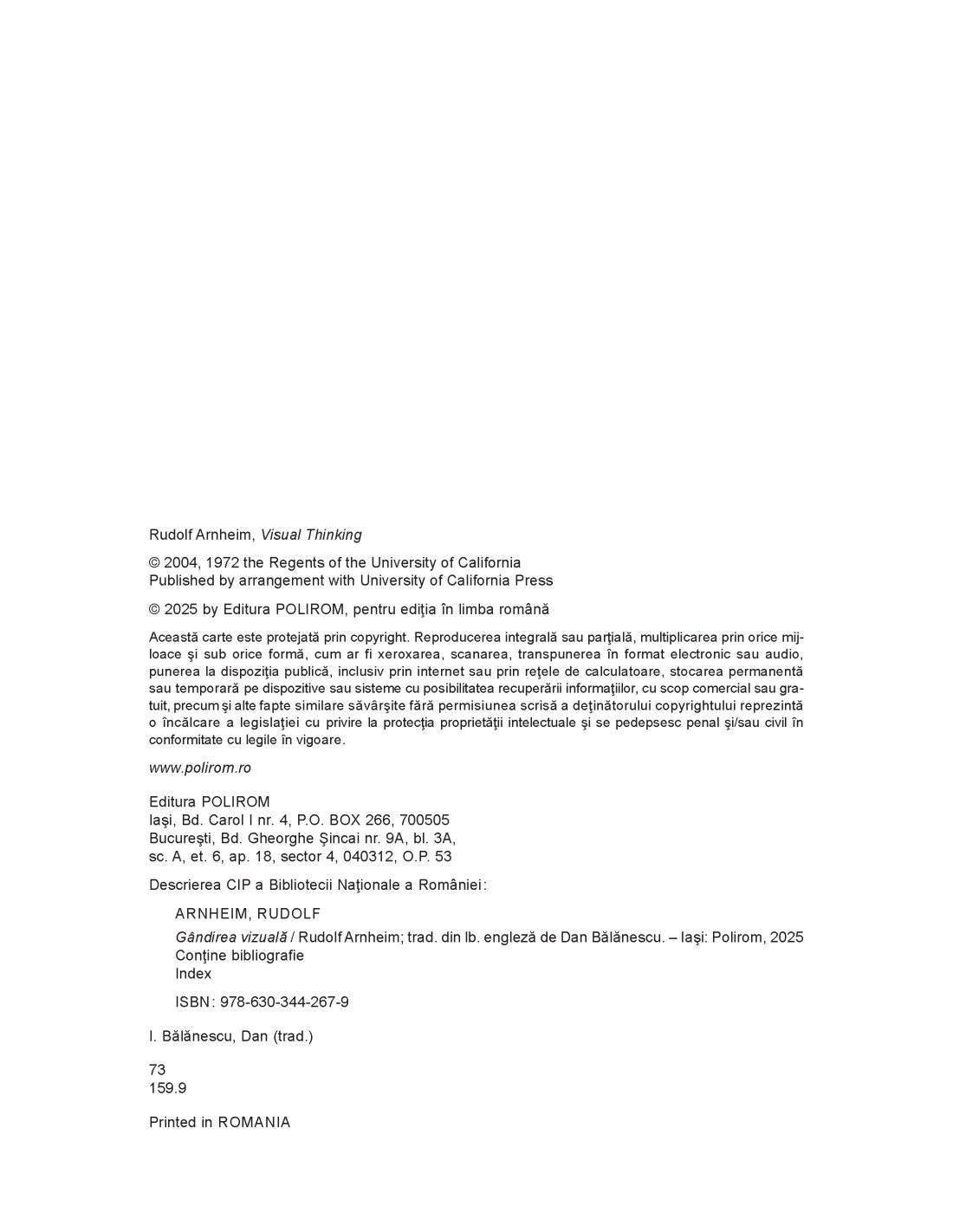 Rudolf ARNHEIM (1904-2007) a fost profesor emerit de psihologia artei la Universitatea Harvard. Dintre volumele publicate amintim: Film as Art, The Dynamics of Architectural Forms și The Split and the Structure: Twenty-Eight Essays. De același autor, la Editura Polirom au mai apărut Arta și percepția vizuală. O psihologie a văzului creator (2011, 2022) și Forța centrului vizual. Un studiu al compoziţiei în artele vizuale (2012).