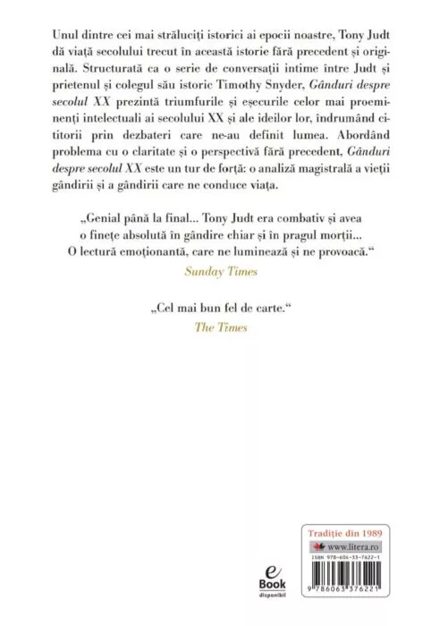 Unul dintre cei mai străluciți istorici ai epocii noastre, Tony Judt dă viață secolului trecut în această istorie fără precedent și originală. Structurată ca o serie de conversații intime între Judt și prietenul și colegul său istoric Timothy Snyder, Gânduri despre secolul XX prezintă triumfurile și eșecurile celor mai proeminenți intelectuali ai secolului XX și ale ideilor lor, îndrumând cititorii prin dezbateri care ne-au definit lumea. Abordând problema cu o claritate și o perspectivă fără precedent, Gânduri despre secolul XX este un tur de forță: o analiză magistrală a vieții gândirii și a gândirii care ne conduce viața.