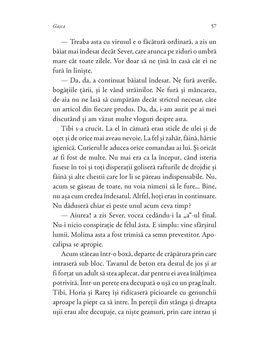 În cartea Gașca, în timpul izolării impuse de pandemia de COVID-19, un grup de prieteni – Tibi, Rareș, Horia și Luca –, sătui de școală online și de singurătate, decid să iasă pe furiș din case pentru a merge la bunica lui Tibi.