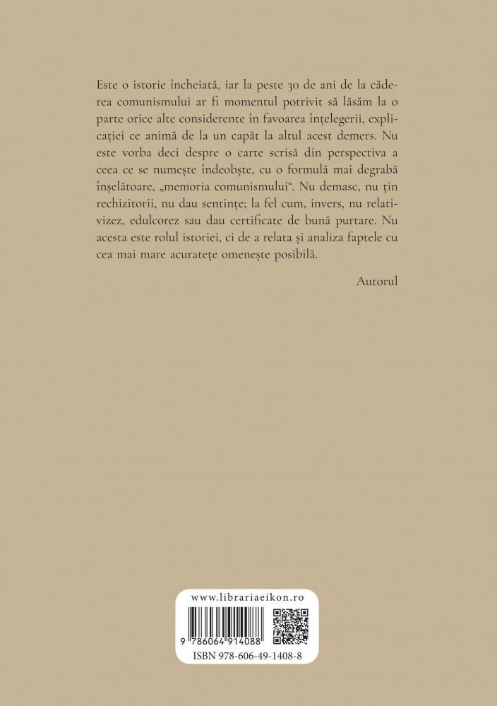 Este o istorie încheiată, iar la peste 30 de ani de la căderea comunismului ar fi momentul potrivit să lăsăm la o parte orice alte considerente în favoarea înțelegerii, explicației ce animă de la un capăt la altul acest demers. Nu este vorba deci despre o carte scrisă din perspectiva a ceea ce se numește îndeobște, cu o formulă mai degrabă înșelătoare, „memoria comunismului“. Nu demasc, nu țin rechizitorii, nu dau sentințe; la fel cum, invers, nu relativizez, edulcorez sau dau certificate de bună purtare. Nu acesta este rolul istoriei, ci de a relata și analiza faptele cu cea mai mare acuratețe omenește posibilă. - Autorul
