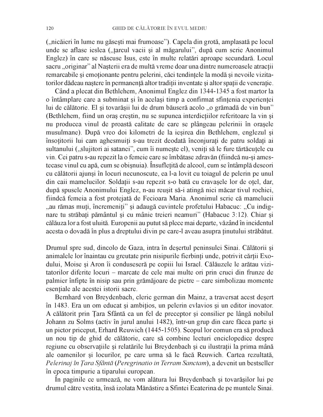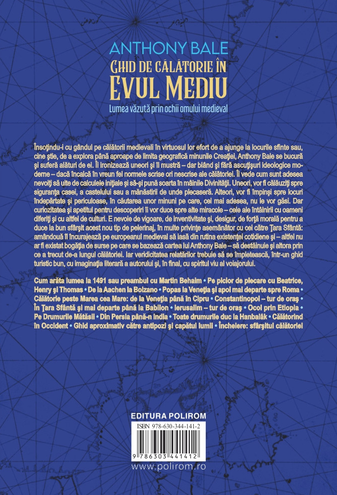 Însoţindu-i cu gândul pe călătorii medievali în virtuosul lor efort de a ajunge la locurile sfinte sau, cine ştie, de a explora până aproape de limita geografică minunile Creaţiei, Anthony Bale se bucură şi suferă alături de ei. Îi ironizează uneori şi îi mustră – dar blând şi fără ascuţişuri ideologice moderne – dacă încalcă în vreun fel normele scrise ori nescrise ale călătoriei. Îi vede cum sunt adesea nevoiţi să uite de calculele iniţiale şi să-şi pună soarta în mâinile Divinităţii. Uneori, vor fi călăuziţi spre siguranţa casei, a castelului sau a mănăstirii de unde plecaseră. Alteori, vor fi împinşi spre locuri îndepărtate şi periculoase, în căutarea unor minuni pe care, cel mai adesea, nu le vor găsi. Dar curiozitatea şi apetitul pentru descoperiri îi vor duce spre alte miracole – cele ale întâlnirii cu oameni diferiţi şi cu altfel de culturi. E nevoie de vigoare, de inventivitate şi, desigur, de forţă morală pentru a duce la bun sfârşit acest nou tip de pelerinaj, în multe privinţe asemănător cu cel către Ţara Sfântă: amândouă îl încurajează pe europeanul medieval să iasă din rutina existenţei cotidiene şi – altfel nu ar fi existat bogăţia de surse pe care se bazează cartea lui Anthony Bale – să destăinuie şi altora prin ce a trecut de-a lungul călătoriei. Iar veridicitatea relatărilor trebuie să se împletească, într-un ghid turistic bun, cu imaginaţia literară a autorului şi, în final, cu spiritul viu al voiajorului.