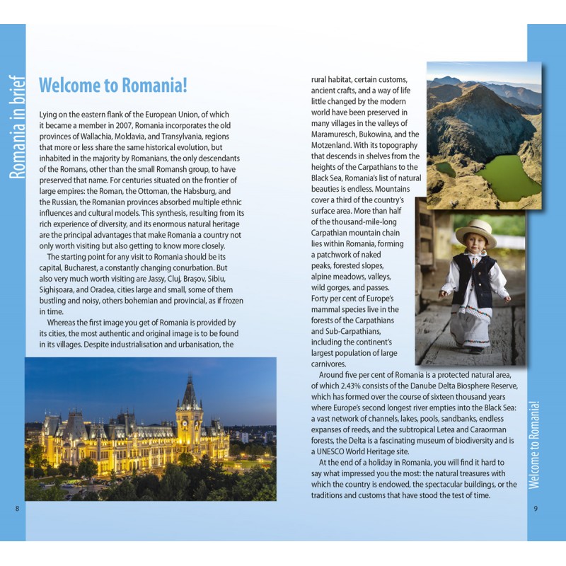 Ghidul turistic România (traducere în limba engleză), din colecția ®Călător pe mapamond, oferă informații detaliate, hărți și sfaturi practice pentru călători. Include trasee turistice variate, recomandări și un top 10 al experiențelor și atracțiilor de neratat.