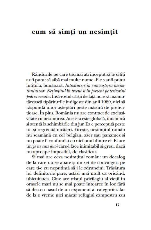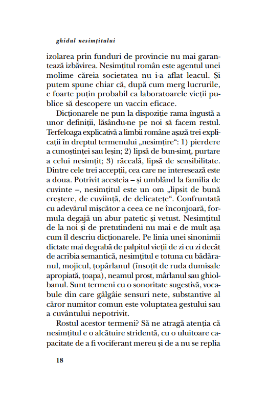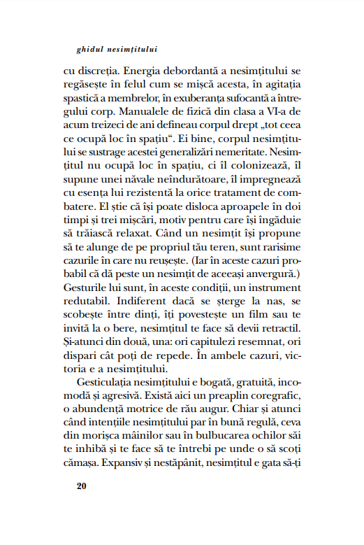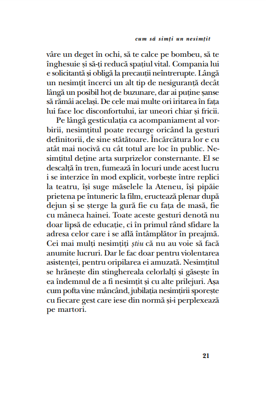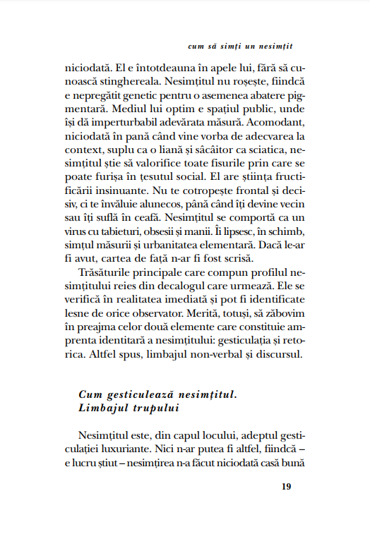 Nesimţirea e un virus redutabil, cu instalare rapidă şi efecte demolatoare. Ea se instalează în aproapele anonim, dar îi afectează mai mult pe cei din jur. Nesimţitul devine pe zi ce trece o prezenţă constantă, greu de evitat şi imposibil de strunit. În tren sau la operă, în autobuz sau la biserică, în parc sau la teatru, în Parlament sau la bloc, reprezentanţii acestei categorii fondează un cult volatil, fără agendă şi fără orizont. Religia lor e sfidarea celorlalţi. Nesimţitul nu are un cod de reguli, dar se comportă ca şi cum l-ar avea. E invaziv până la ubicuitate, pisălog până la nevroză şi vociferant până la delir. Îl vezi unde nu te aştepţi, îl auzi peste tot, îl adulmeci la fiecare colţ de stradă şi pe fiecare culoar de vagon. Însă nici măcar el nu deţine toate pârghiile meşteşugului. E imperfect şi are nevoie de îndrumări. Exact asta face Ghidul nesimţitului – furnizează reglajele necesare celor ispitiţi de performanţa în domeniu. Sigur, miza lui formativă şi informativă e o glumă. Ghidul nesimţitului vrea în primul rând să amuze. Numai că în spatele tonului ironic al cărţii răsar fapte, întâmplări şi buclucuri de care foarte mulţi dintre noi au avut parte. Şi peste care n-au putut trece doar cu un duş, o casetă cu muzică de relaxare sau o înjurătură bine ţintită.