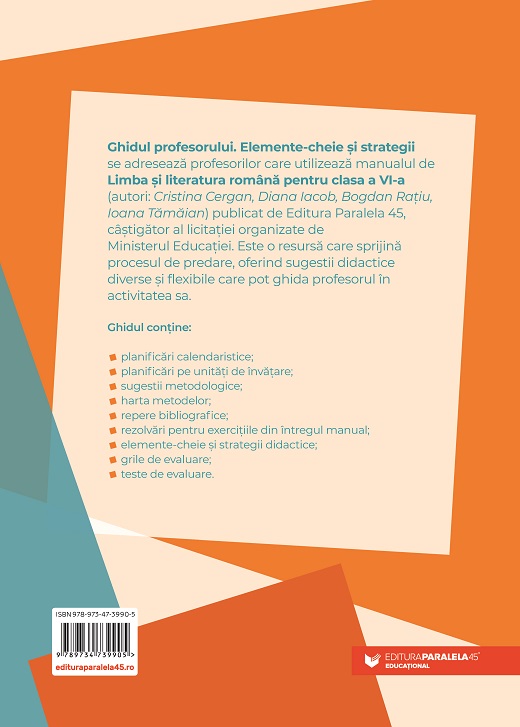 Ghidul profesorului. Elemente-cheie și strategii se adresează profesorilor care utilizează manualul de Limba și literatura română. Clasa a VI-a (autori: Cristina Cergan, Diana Iacob, Bogdan Rațiu, Ioana Tămăian) publicat de Editura Paralela 45, câștigător al licitației organizate de Ministerul Educației. Este o resursă care sprijină procesul de predare, oferind sugestii didactice diverse și flexibile care pot ghida profesorul în activitatea sa.