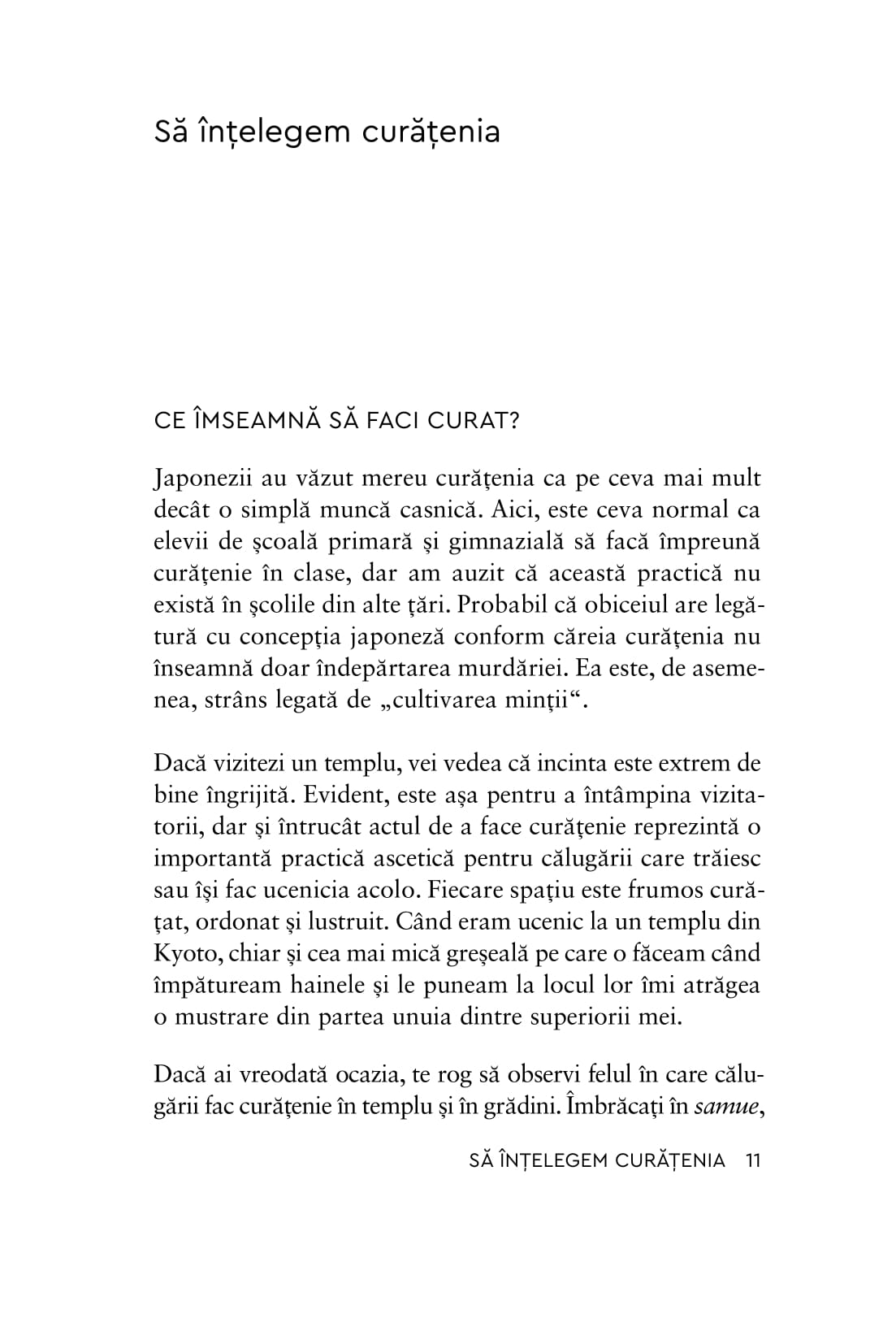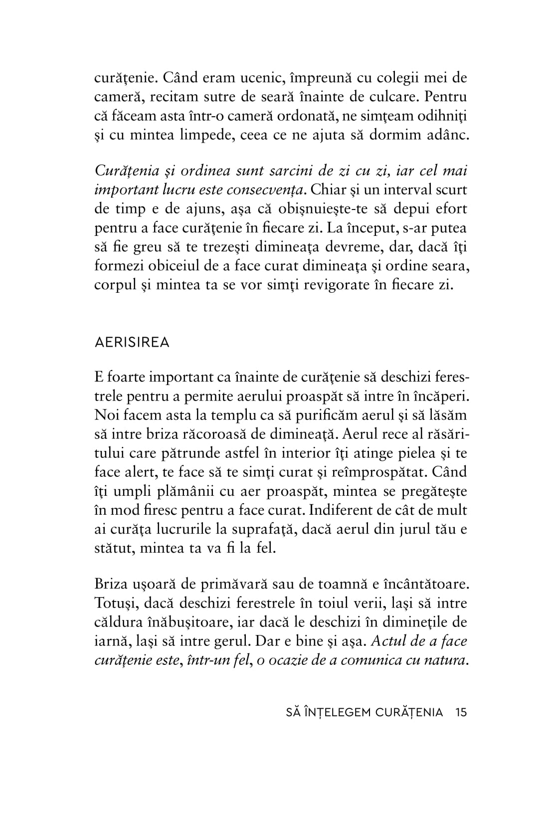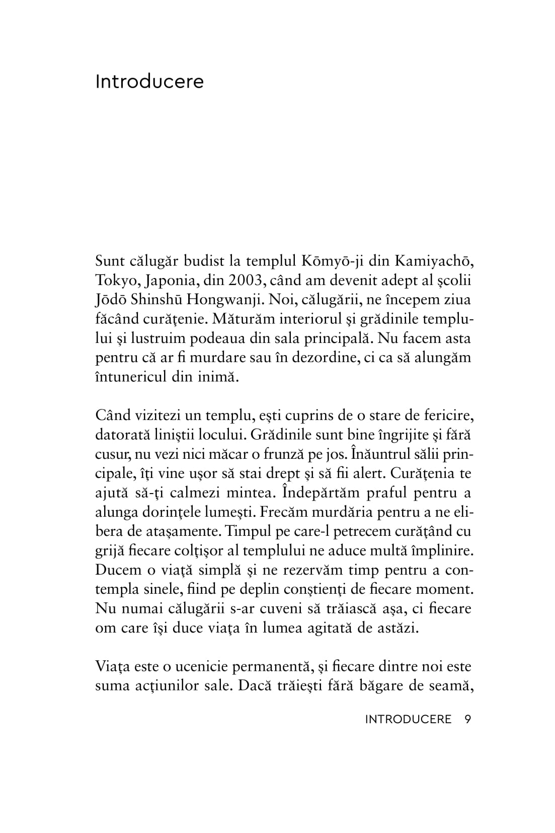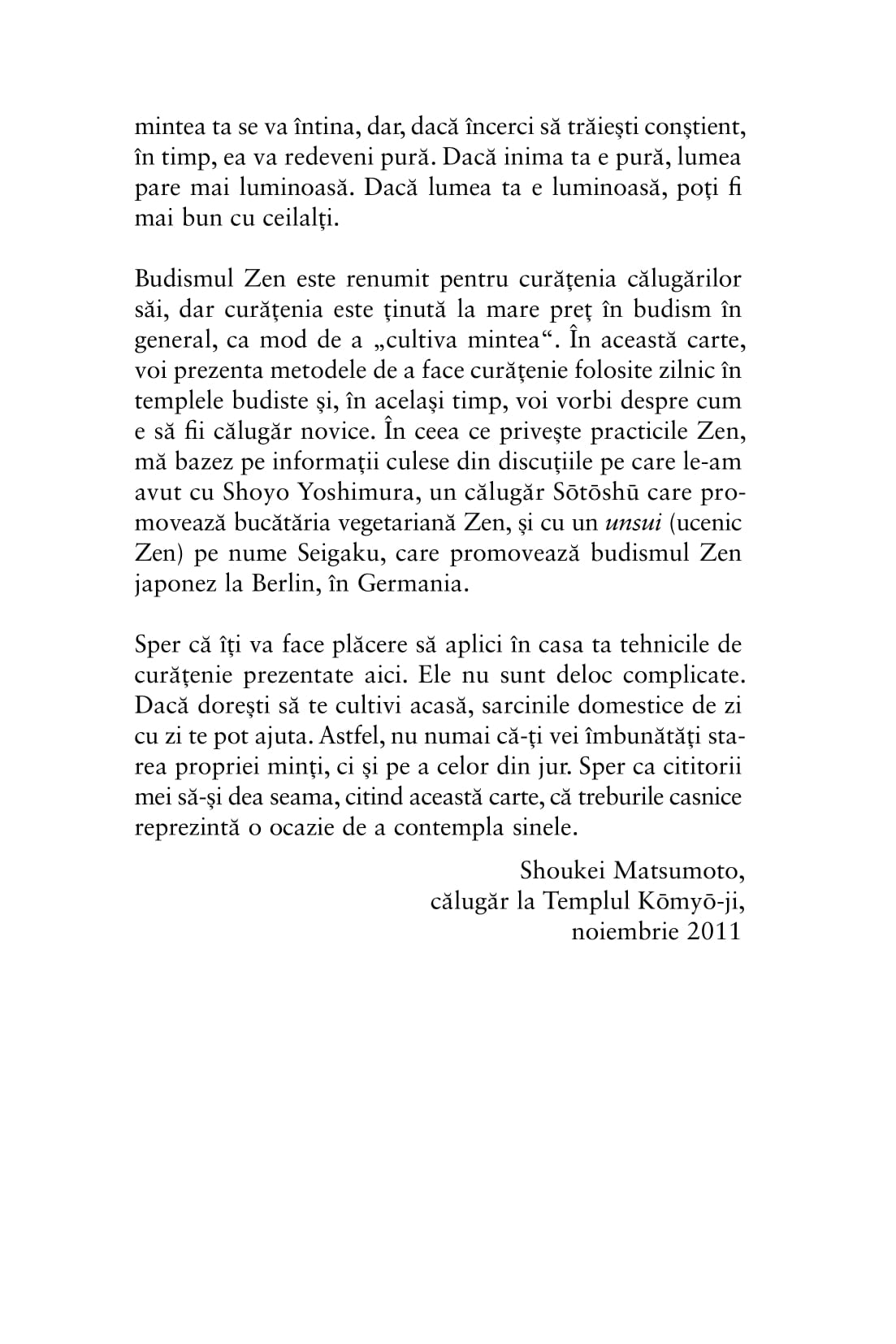 Călugării Zen sunt recunoscuți pentru disciplina cu care își cultivă mintea și sufletul, dar și pentru curățenia templelor în care viețuiesc. Citind acest ghid în egală măsură spiritual și practic, tradus în peste 15 limbi, înțelegem de ce tehnicile de purificare a minții și metodele de curățenie sunt de fapt două fațete ale unei singure realități. Străvechile tradiții budiste legate de meditație și de străduința permanentă spre Iluminare devin aici accesibile omului occidental prin sfaturi legate de rutina zilnică. Shoukei Matsumoto analizează în detaliu aspecte ale vieții noastre cotidiene – de la somn până la alimentație, de la igiena personală până la întreținerea garderobei, a casei și a grădinii. Totul stă sub semnul grijii față de sine și față de obiectele și natura înconjurătoare.