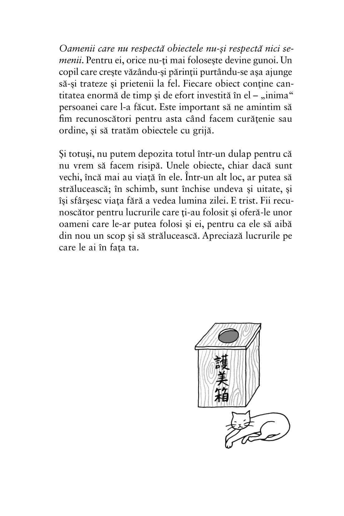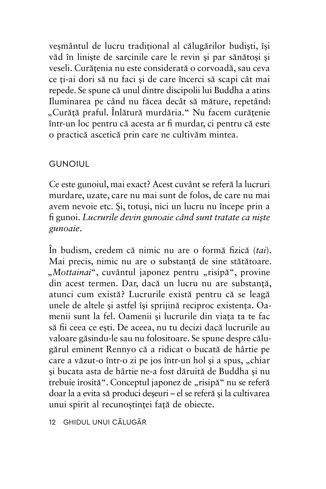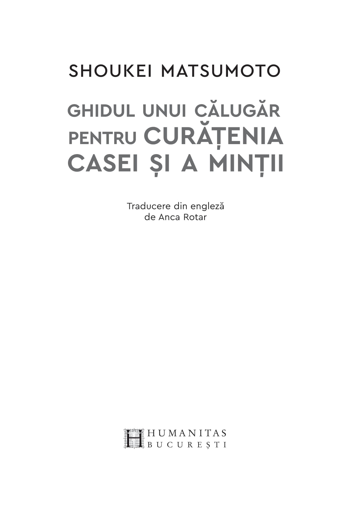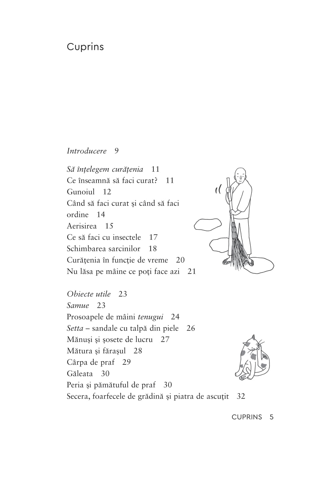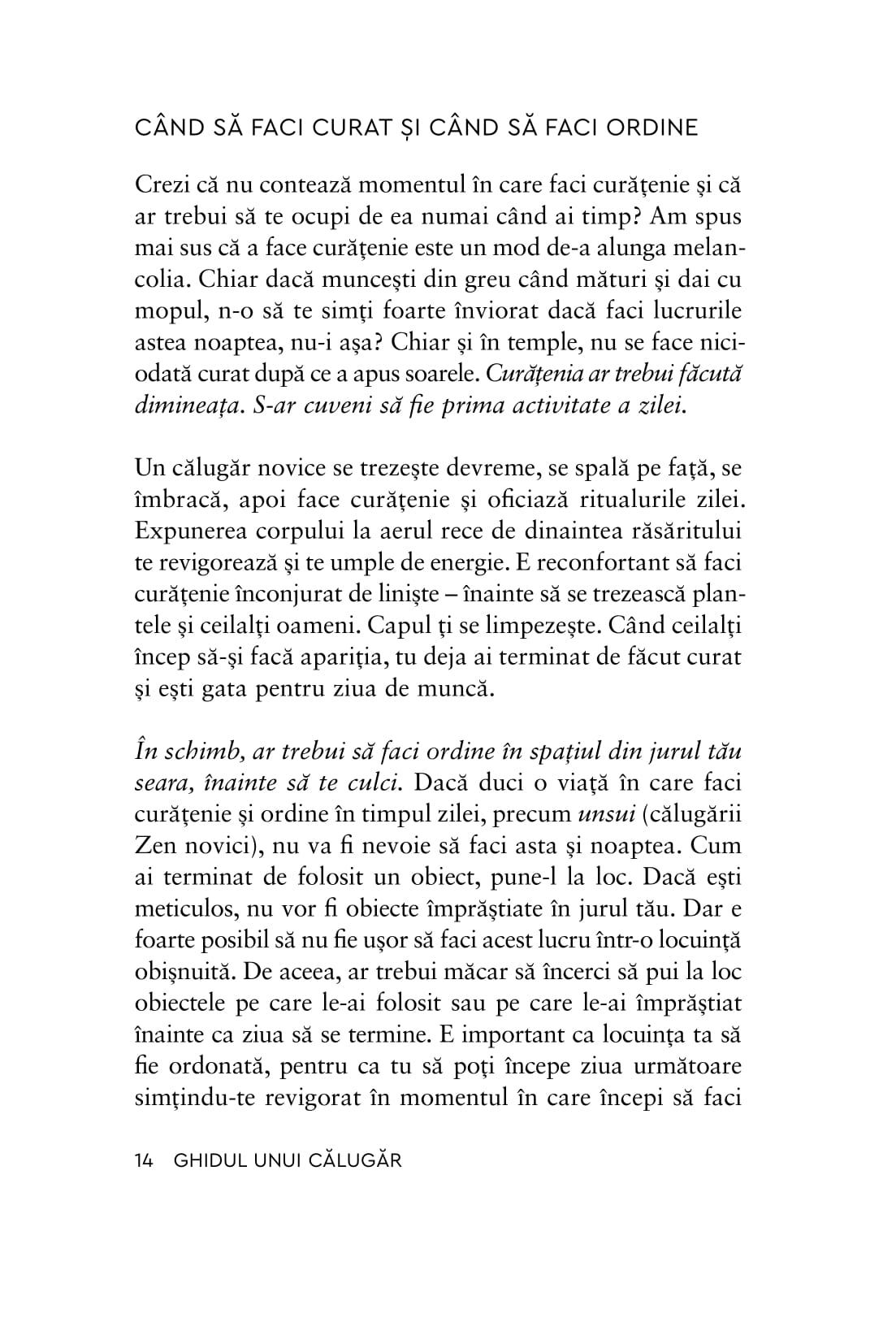 Călugării Zen sunt recunoscuți pentru disciplina cu care își cultivă mintea și sufletul, dar și pentru curățenia templelor în care viețuiesc. Citind acest ghid în egală măsură spiritual și practic, tradus în peste 15 limbi, înțelegem de ce tehnicile de purificare a minții și metodele de curățenie sunt de fapt două fațete ale unei singure realități. Străvechile tradiții budiste legate de meditație și de străduința permanentă spre Iluminare devin aici accesibile omului occidental prin sfaturi legate de rutina zilnică. Shoukei Matsumoto analizează în detaliu aspecte ale vieții noastre cotidiene – de la somn până la alimentație, de la igiena personală până la întreținerea garderobei, a casei și a grădinii. Totul stă sub semnul grijii față de sine și față de obiectele și natura înconjurătoare.