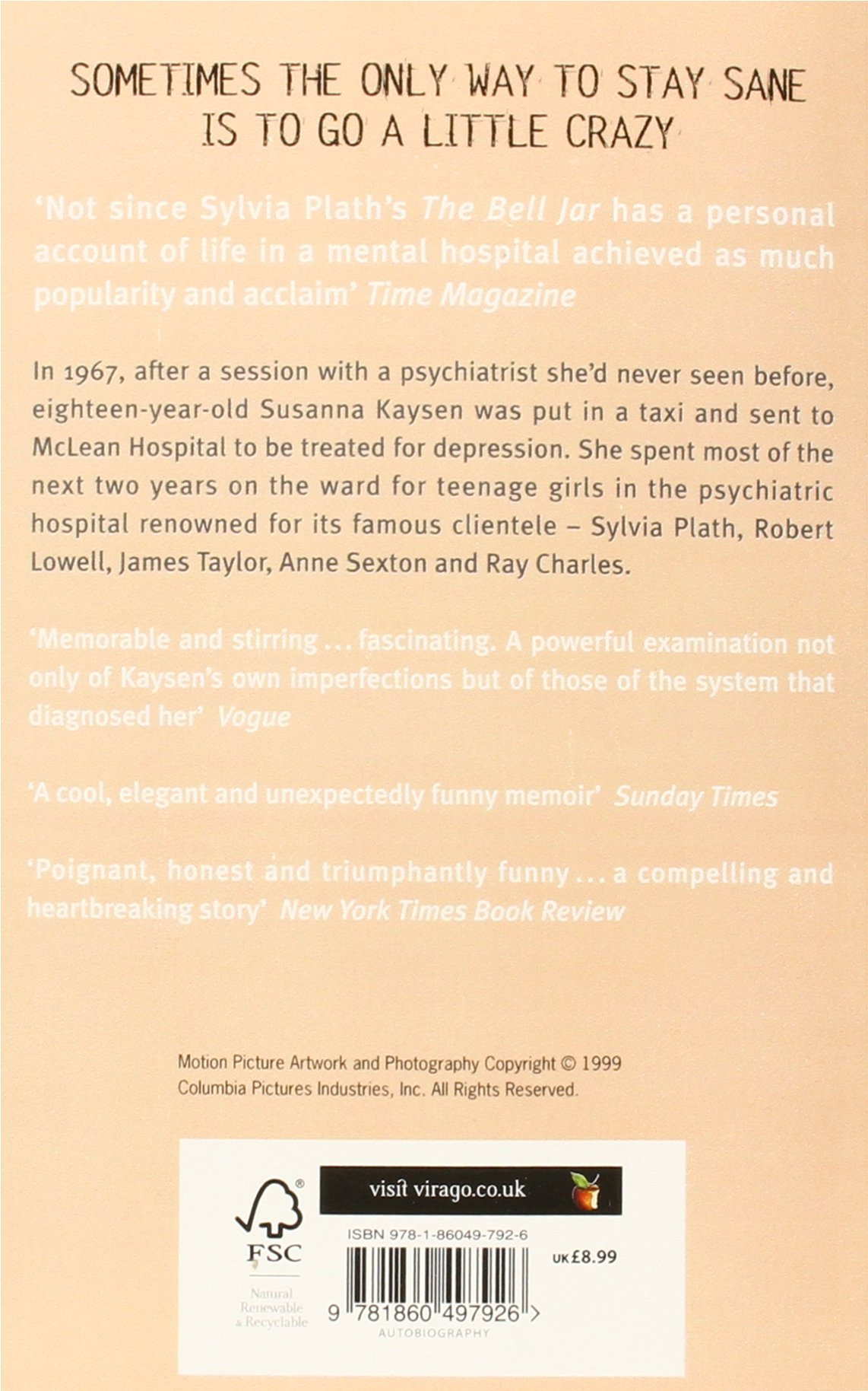 In 1967, after a session with a psychiatrist she'd never seen before, eighteen-year-old Susanna Kaysen was put in a taxi and sent to McLean Hospital to be treated for depression. She spent most of the next two years on the ward for teenage girls in a psychiatric hospital renowned for its famous clientele - Sylvia Plath, Robert Lowell, James Taylor and Ray Charles. A clear-sighted, unflinching work that provokes questions about our definitions of sane and insane, Kaysen's extraordinary memoir encompasses horror and razor-edged perception while providing vivid portraits of her fellow patients and their keepers.