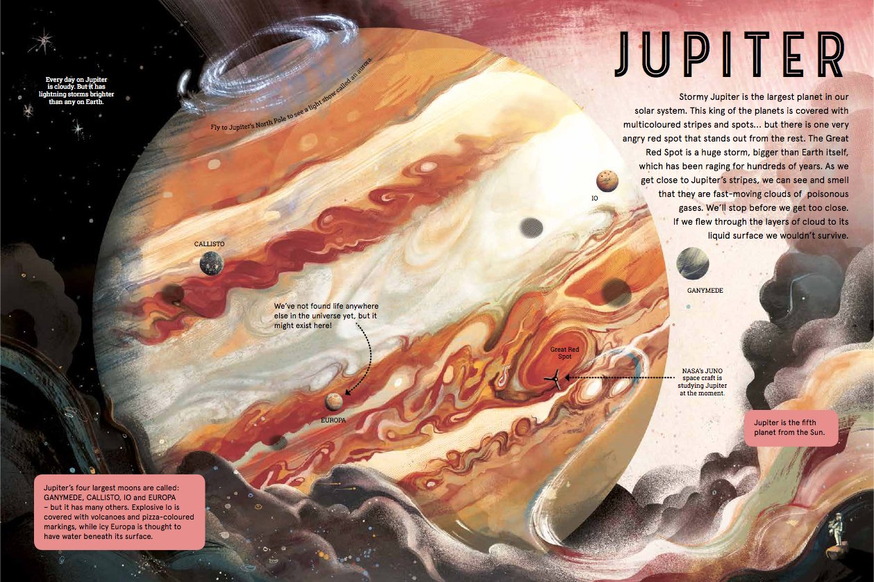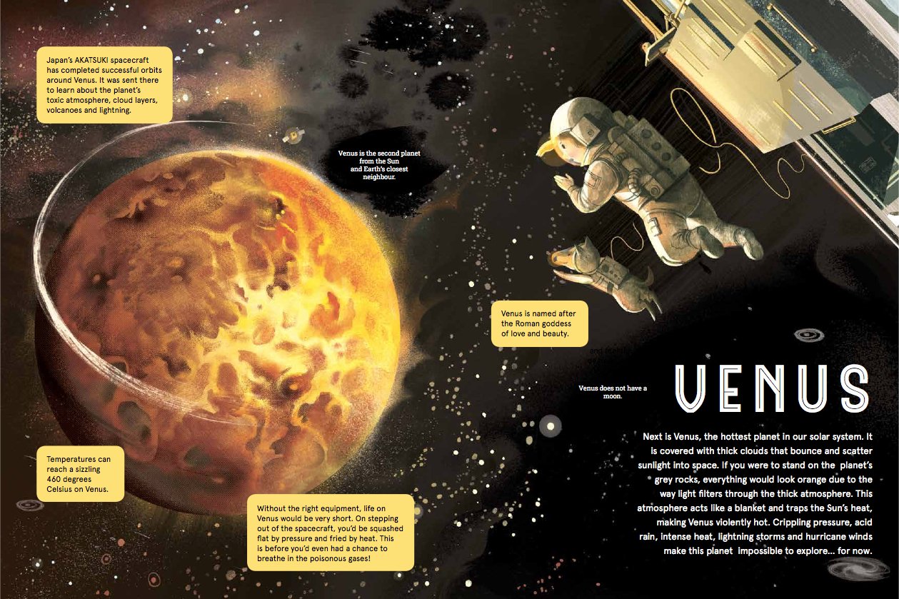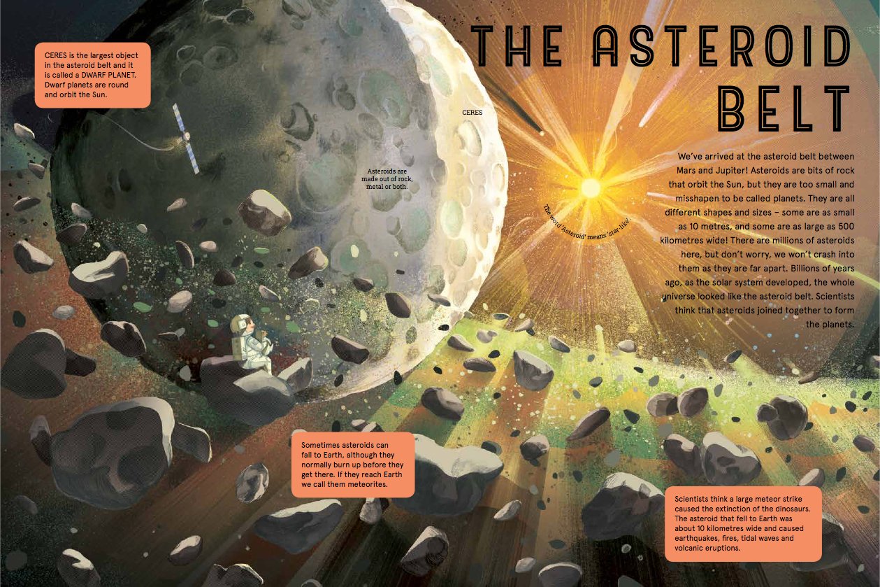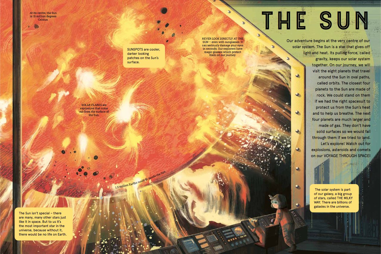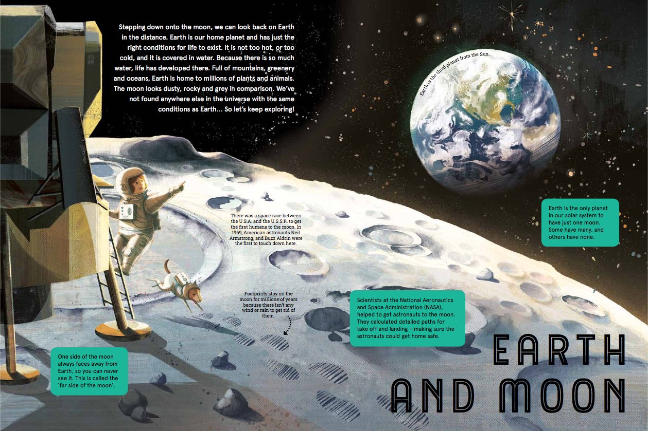 Join one little astronaut and her space dog as they voyage through our solar system and see space as you've never seen it before! Journey from the sun, to the planets, asteroids and Kuiper belt, before folding out your glow-in-the-dark poster. Simply turn off the light to bring the incredible glow-in-the-dark ink to life.