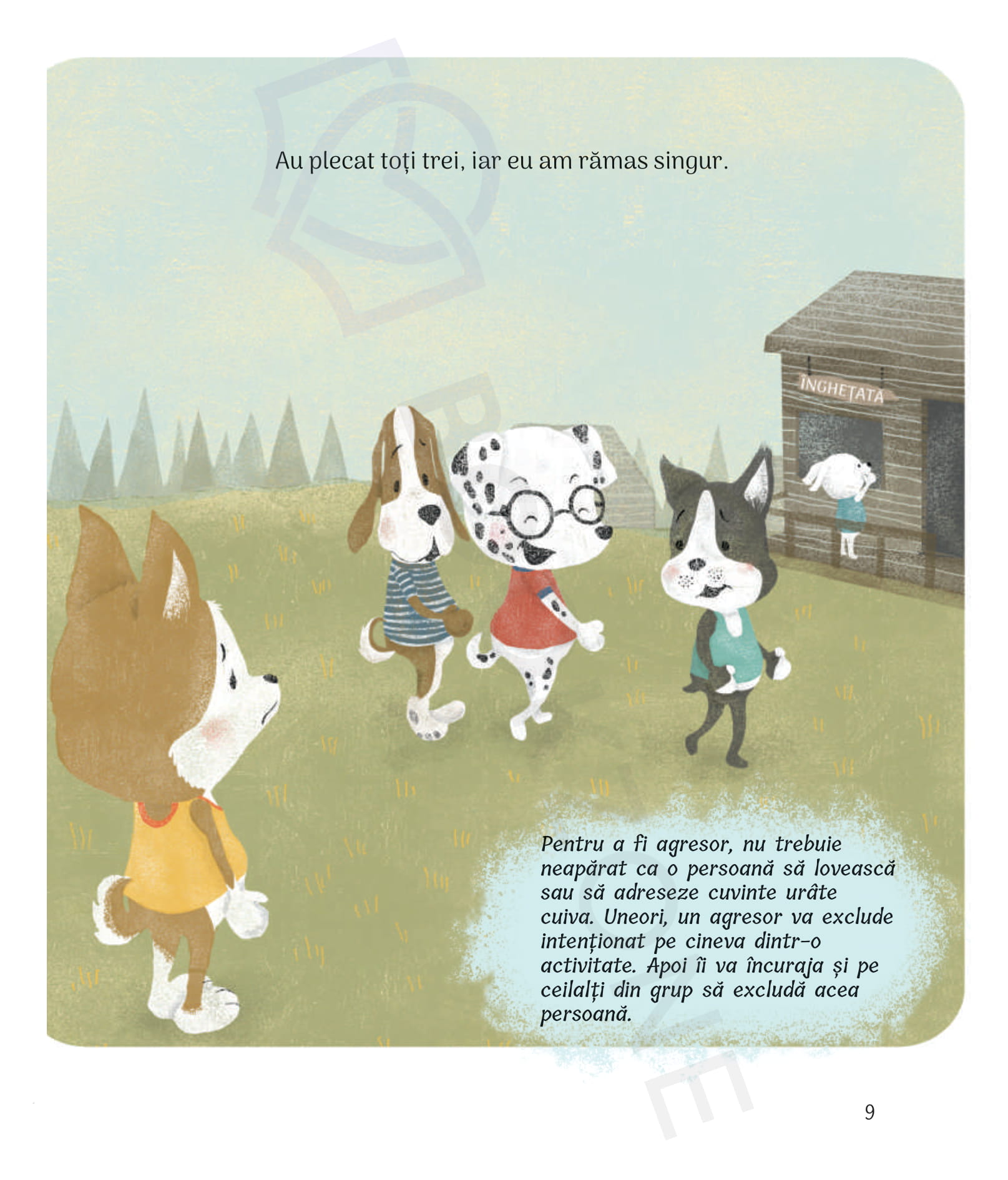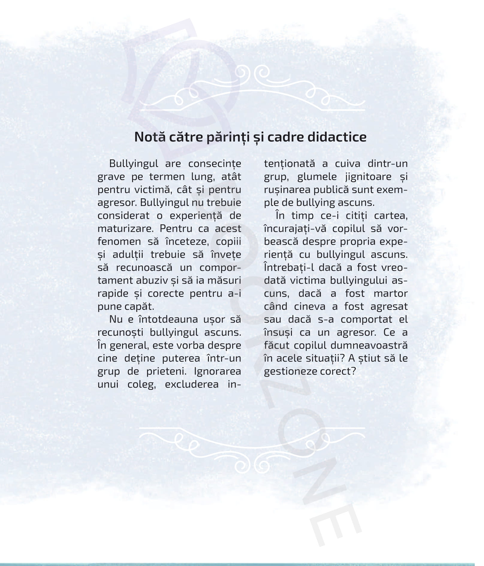 Dacă ai fost vreodată victima bullyingului, nu ai uitat acele momente niciodată. Ți s-a spus că ești prea mare, prea mic sau urât. Știi că ești vulnerabil, iar cineva este pregătit să profite de slăbiciunile tale. Cu siguranță nu îți dorești să experimenteze și copiii tăi aceste sentimente. Comandă povestea ilustrată și ajută-i pe cei mici să recunoască bullyingul!