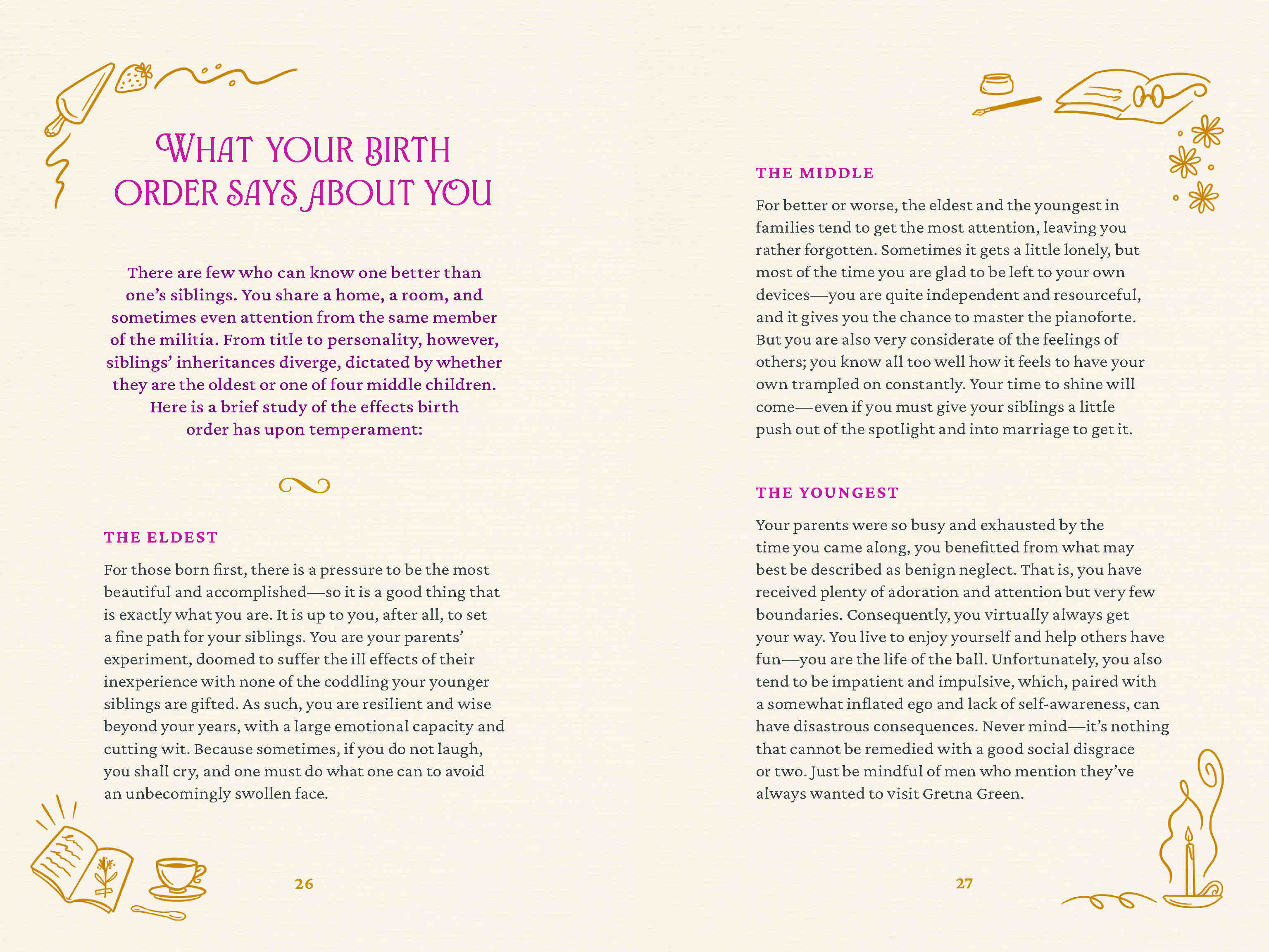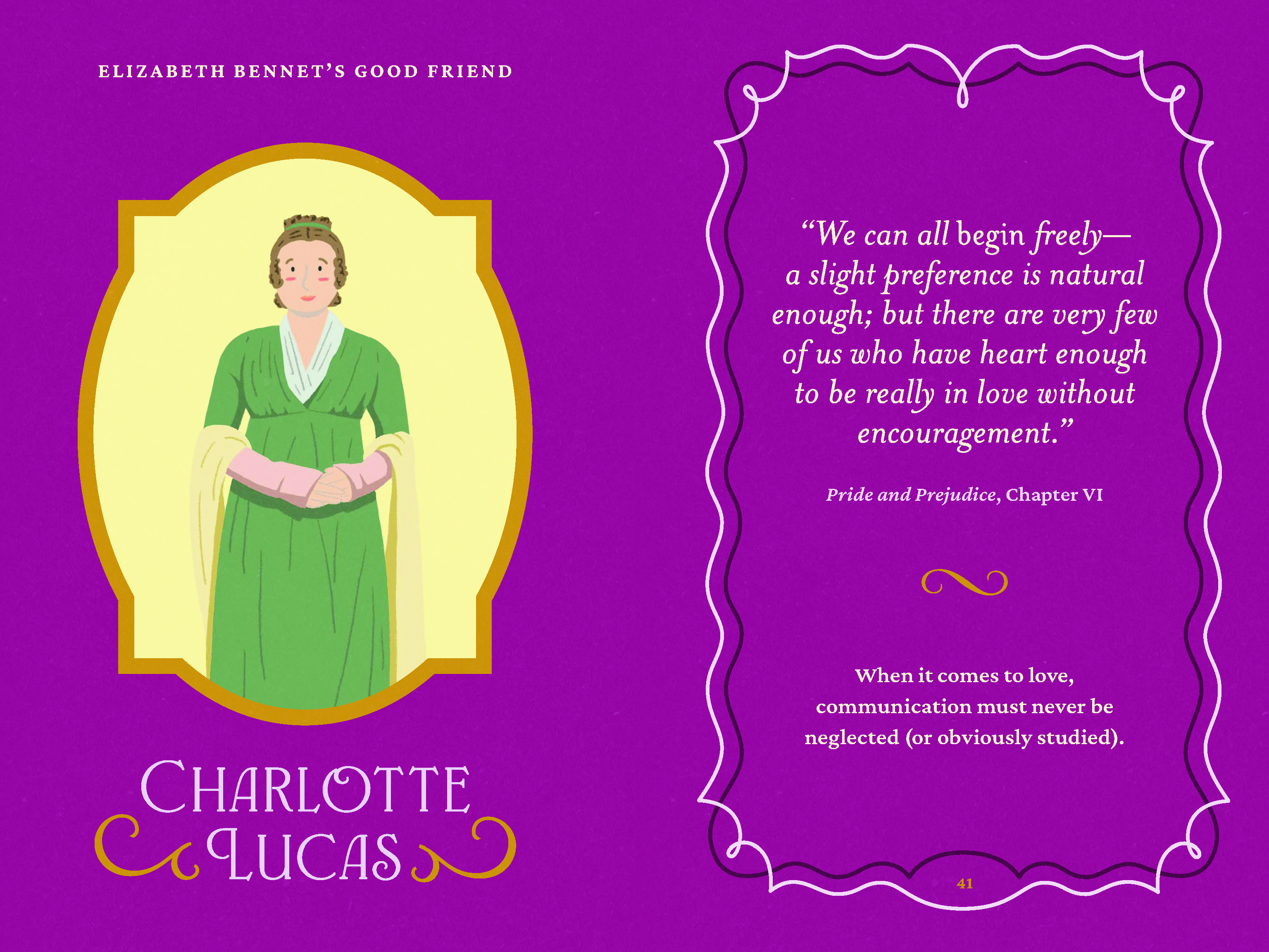 Not sure of the right decision? “Better be without sense than misapply it as you do.” Unsure what to do with an afternoon? “To sit in the shade on a fine day, and look upon verdure, is the most perfect refreshment.” Confused and struggling to make friends? “Your defect is a propensity to hate everybody.” Austen’s wisdom is at readers’ disposal to give the insights needed, whether a sister has eloped with an ex or you’re in love with a stepbrother.