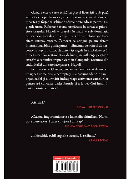 Sub pază armată de la publicarea ei, amenințat în repetate rânduri cu moartea și forțat să schimbe adrese peste adrese pentru a-și pierde urma, Roberto Saviano urmărește în cartea sa prăbușirea orașului Napoli – orașul său natal – sub dominația Camorrei, o rețea de crimă organizată de o amploare și o ferocitate cutremurătoare. Camorra se sprijină pe un sistem internațional bine pus la punct – alimentat de traficul narcotice și deșeuri toxice, de activități ilegale în imobiliare și în lumea creațiilor vestimentare de lux – , iar influența pe care o exercită a schimbat treptat viața în Campania, regiunea din sudul Italiei din care face parte și Napoli.