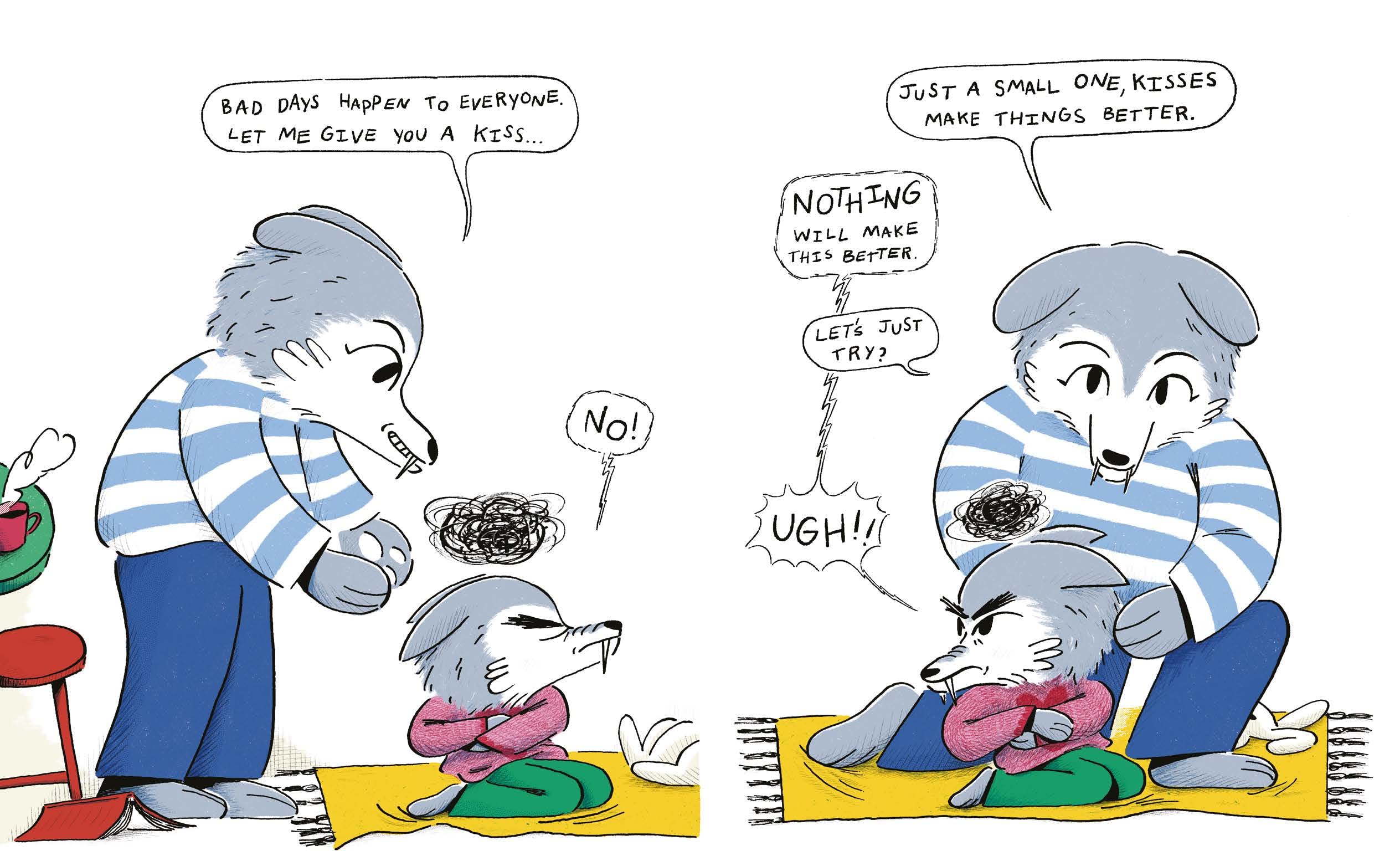 The day gets progressively worse; he's forgotten his homework, it's egg salad for lunch, and then mum is late for pick-up. A kiss perhaps?