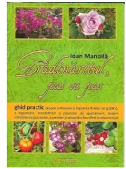 Gradinaritul, pas cu pas – un ghid practic ce se adreseaza gradinarilor amatori. Cartea contine sfaturi, idei, sugestii pentru cei pasionati de cultivarea florilor de gradina si de apartament, a trandafirilor, legumelor, vitei-de-vie, oferind, totodata, informatii esentiale despre intretinerea gazonului, a pomilor fructiferi, a gardului viu si a arbustilor ornamentali. Pas cu pas, veti afla care sunt lucrarile specifice fiecarei luni si va veti insusi notiuni de baza despre cultivarea rasadurilor de legume si flori, despre plantarea lor in gradina sau balcon, despre ingrijirea corecta a trandafirilor si a pomilor, despre tabieturile unor plante de apartament.