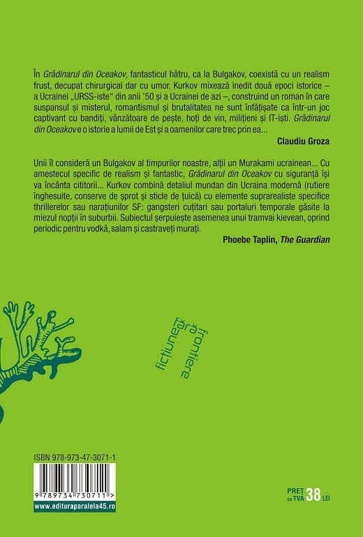 În Grădinarul din Oceakov, fantasticul hâtru, ca la Bulgakov, coexistă cu un realism frust, decupat chirurgical dar cu umor. Kurkov mixează inedit două epoci istorice – a Ucrainei „URSS-iste“ din anii ’50 și a Ucrainei de azi –, construind un roman în care suspansul și misterul, romantismul și brutalitatea ne sunt înfățișate ca într-un joc captivant cu bandiți, vânzătoare de pește, hoți de vin, milițieni și IT-iști. Grădinarul din Oceakov e o istorie a lumii de Est și a oamenilor care trec prin ea… - Claudiu Groza
