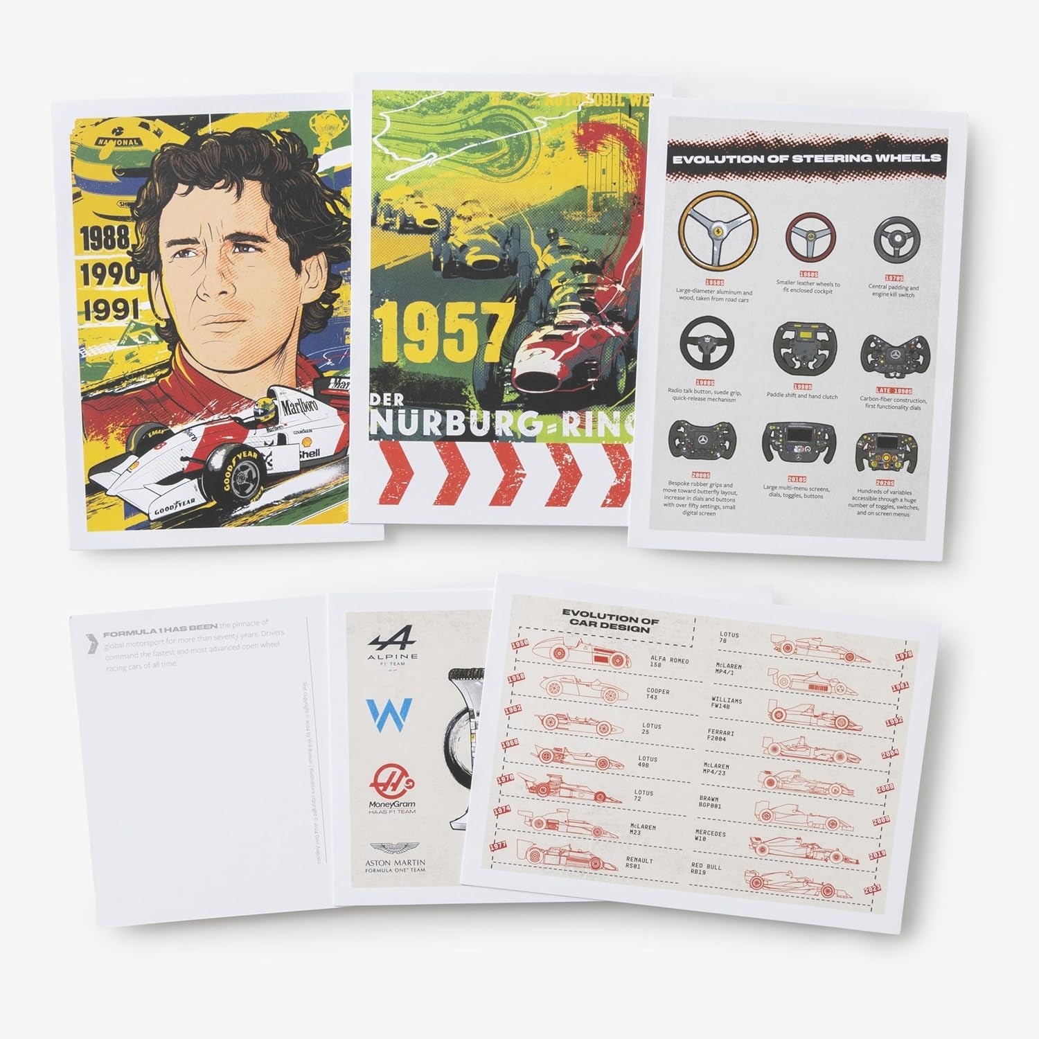 Each postcard encompasses the history of the sport, including incredible artwork of seminal races and portraits of world champions such as Niki Lauda, Ayrton Senna, Michael Schumacher, and Sir Lewis Hamilton.