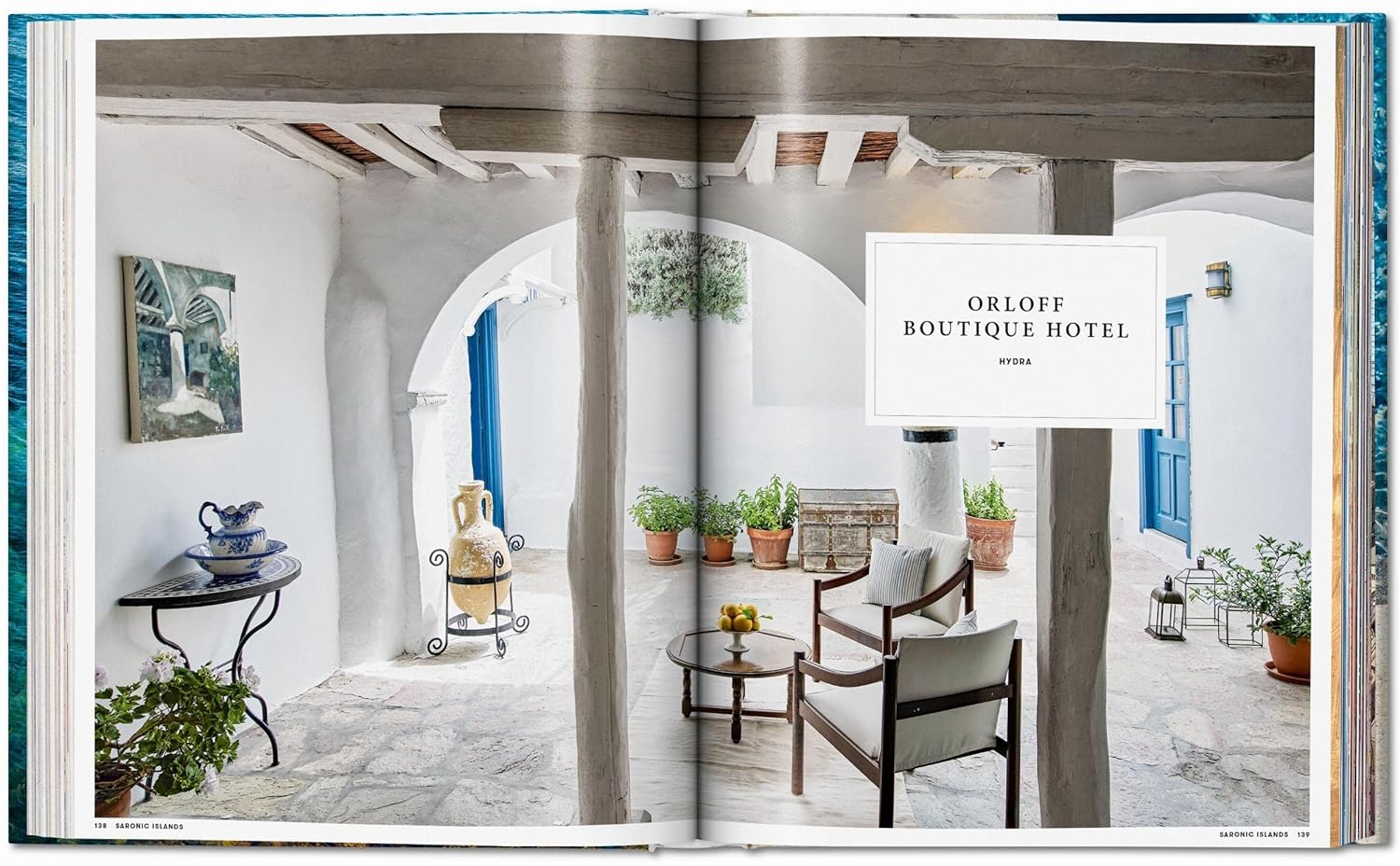 The fresh and healthy cuisine, the crystal clear sea, and the canvas-worthy sunsets do the rest―a trip to Greece is pure delight. Angelika Taschen travels from the mountains of Macedonia in the north to the Peloponnese with its mythical places like Corinth, Sparta, and Olympia, and to the larger and smaller groups of islands in the south. She opens the doors to some of the country’s most extraordinary hotels, including Imaret in Kavala, located in a former Ottoman complex; Tainaron Blue Retreat in a secluded former defense tower in the Mani; and The Windmill, a converted windmill on the island of Kimolos in the Cyclades. She invites readers to discover legendary luxury hotels, like Eagles Palace in Halkidiki or Poseidonion Grand Hotel on Spetses, and takes them to enchanting B&Bs like Guesthouse Mazaraki in Mystras or Mèlisses on Andros, run by food blogger Allegra Pomilio. Along her itinerary, she visits hotels on well-known picturesque islands―such as the Mystique on Santorini and the Soho Roc House on Mykonos―but also accommodations in remote places like the Mediterraneo on the island of Kastelorizo, which lies in the very southeast of Greece off the Turkish coast. In addition she shows interesting architectural and design concepts, such as The Rou Estate hotel village, a historic, carefully restored hamlet on Corfu; the minimalist Olea All Suite Hotel on Zakynthos; and Ammos on Crete, where no two pieces of furniture are alike and new eccentric pieces are added every year.