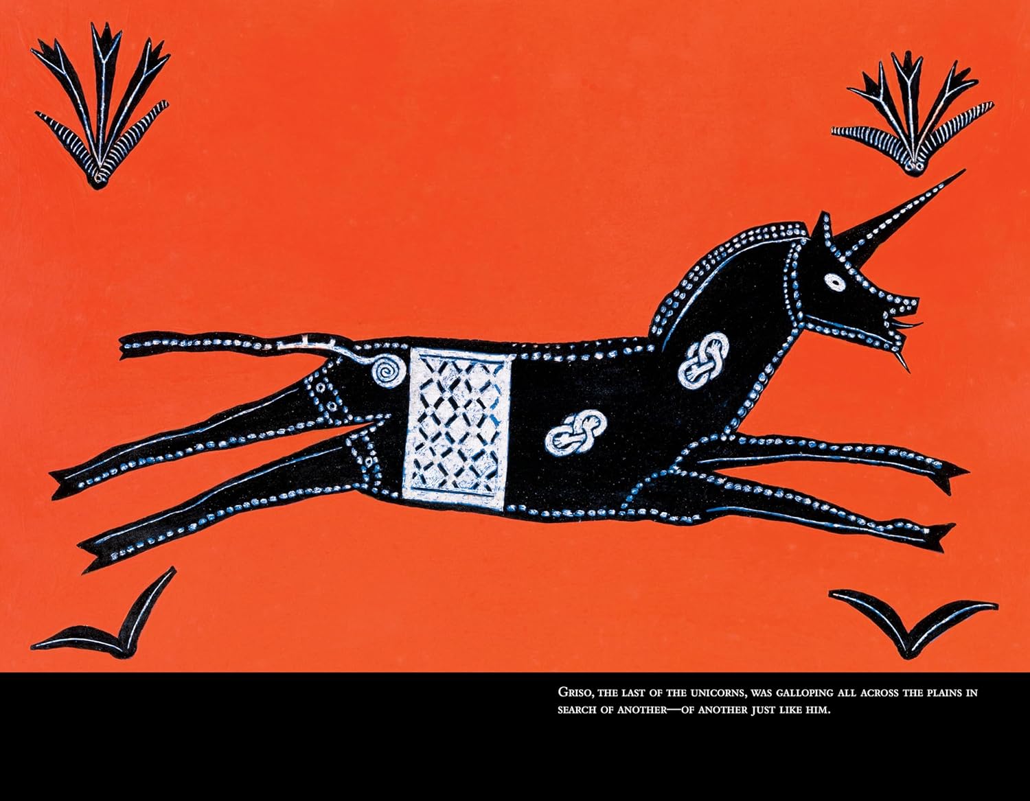 The last of his kind, Griso travels the world searching for unicorn companions. He asks beetles, chameleons, and buffalos if they’ve seen any mythical creatures like him, and all send him on his way saying, “Neither here nor at the edge of the world.” Griso gallops across plains, marshes, and mountains, he trots into the sunset and chats with fearsome narwals by the sea. On each spread, we see Griso rendered in a new artistic style, portrayed as a shadowy cave painting, a chivalrous medieval stead, or lost along a mind-bending surrealist horizon. Griso, the Unique introduces young readers to artistic movements spanning the 7th to 18th century, leaping across time and color with the flip of a page. In Daniel Hahn’s exquisite translation, Griso, the Unique opens the doors to a world of African painting, Tang Dynasty murals, medieval tapestries, and art hidden beneath Egyptian pyramids. A song of color, time, expression, and a fantastical search for belonging by Brazilian visionary, Roger Mello.