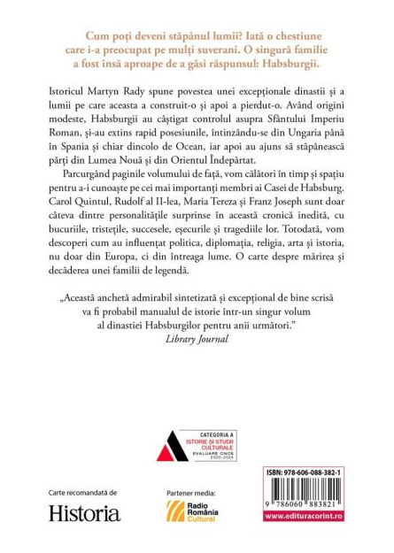 Istoricul Martyn Rady spune povestea unei excepționale dinastii și a lumii pe care aceasta a construit-o și apoi a pierdut-o. Având origini modeste, Habsburgii au câștigat controlul asupra Sfântului Imperiu Roman, și-au extins rapid posesiunile, întinzându-se din Ungaria până în Spania și chiar dincolo de Ocean, iar apoi au ajuns să stăpânească părți din Lumea Nouă și din Orientul Îndepărtat.