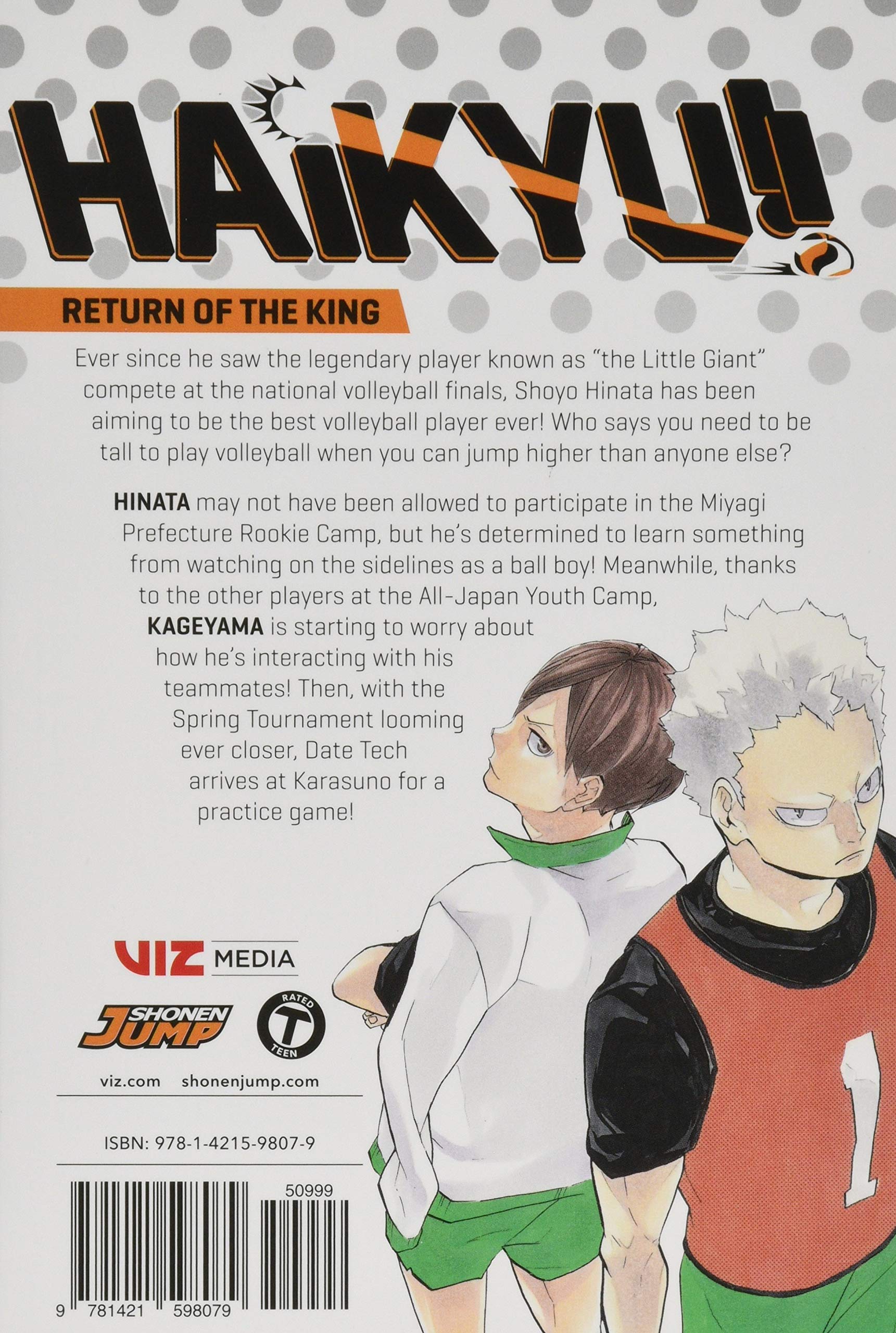 Shoyo Hinata is out to prove that in volleyball you don't need to be tall to fly! Ever since he saw the legendary player known as the Little Giant compete at the national volleyball finals, Shoyo Hinata has been aiming to be the best volleyball player ever! Who says you need to be tall to play volleyball when you can jump higher than anyone else? Hinata may not have been allowed to participate in the Miyagi Prefecture Rookie Camp, but he's determined to learn something from watching on the sidelines as a ball boy! Meanwhile, thanks to the other players at the All-Japan Youth Camp, Kageyama starts to worry about how he interacts with his teammates. Then, with the Spring Tournament looming ever closer, Date Tech arrives at Karasuno for a practice game! The manga behind the hit volleyball anime about a boy who has a dream to overcome his physical limits and fly.