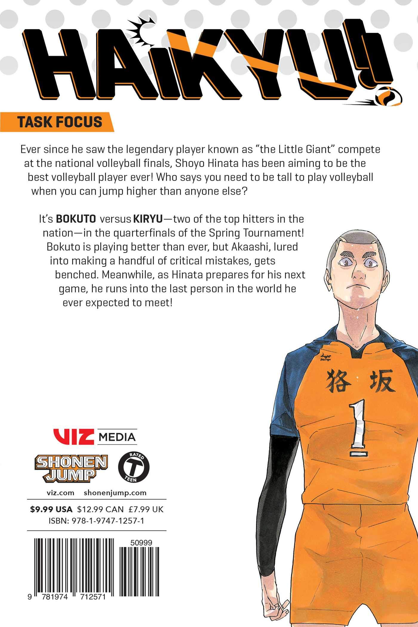 It’s Bokuto versus Kiryu—two of the top hitters in the nation—in the quarterfinals of the Spring Tournament! Bokuto is playing better than ever, but Akaashi, lured into making a handful of critical mistakes, gets benched. Meanwhile, as Hinata prepares for his next game, he runs into the last person in the world he ever expected to meet!